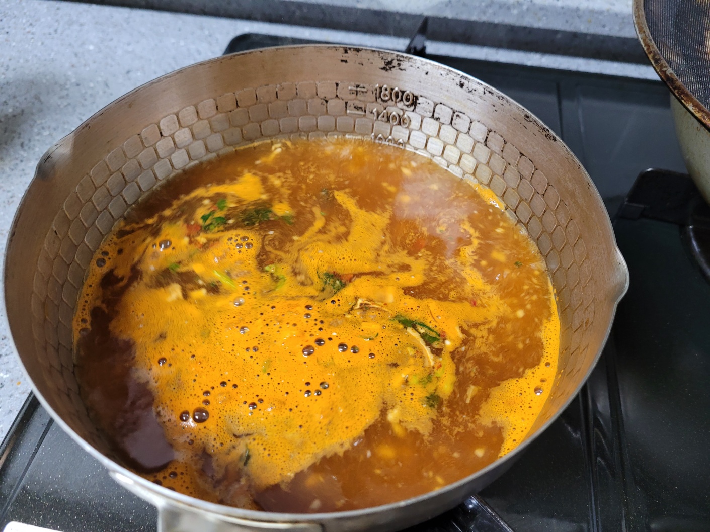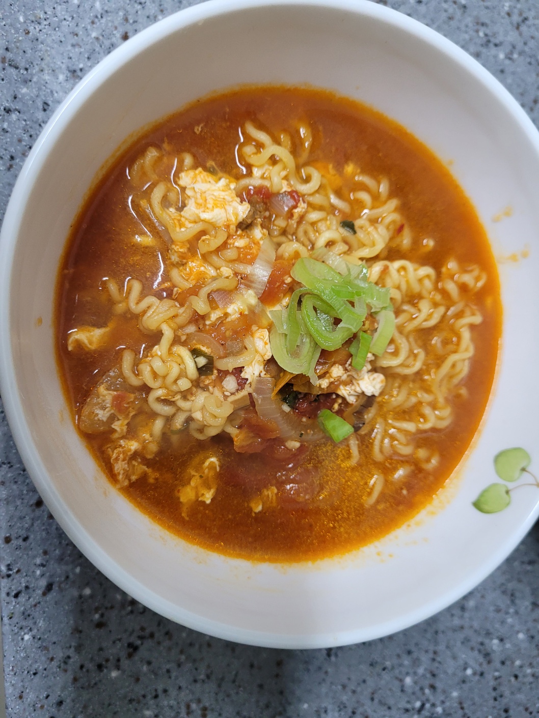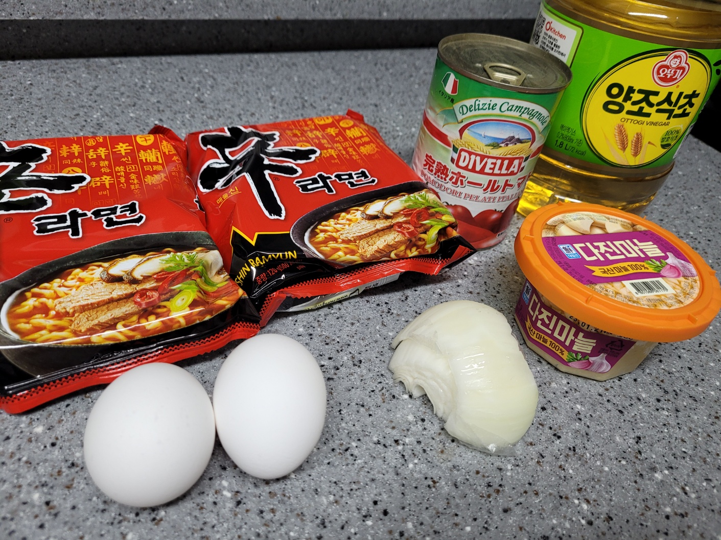 물 1000ml, 라면 2봉지(스프는 1봉지), 홀토마토 통조림 1/2개, 계란 2개, 양파 1/4개, 파 약간, 식초 1큰술, 다진마늘 1큰술