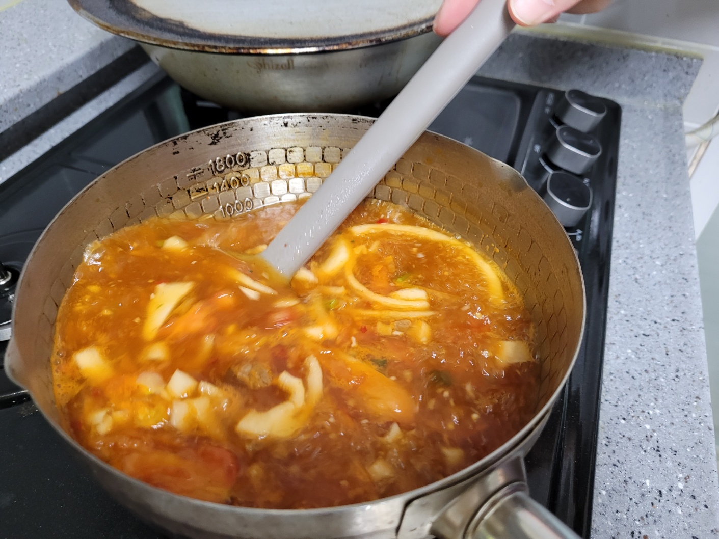 물 1000ml가 끓으면 스프 1봉지, 양파, 홀토마토 1/2 통조림, 다진마늘을 넣어준 후
