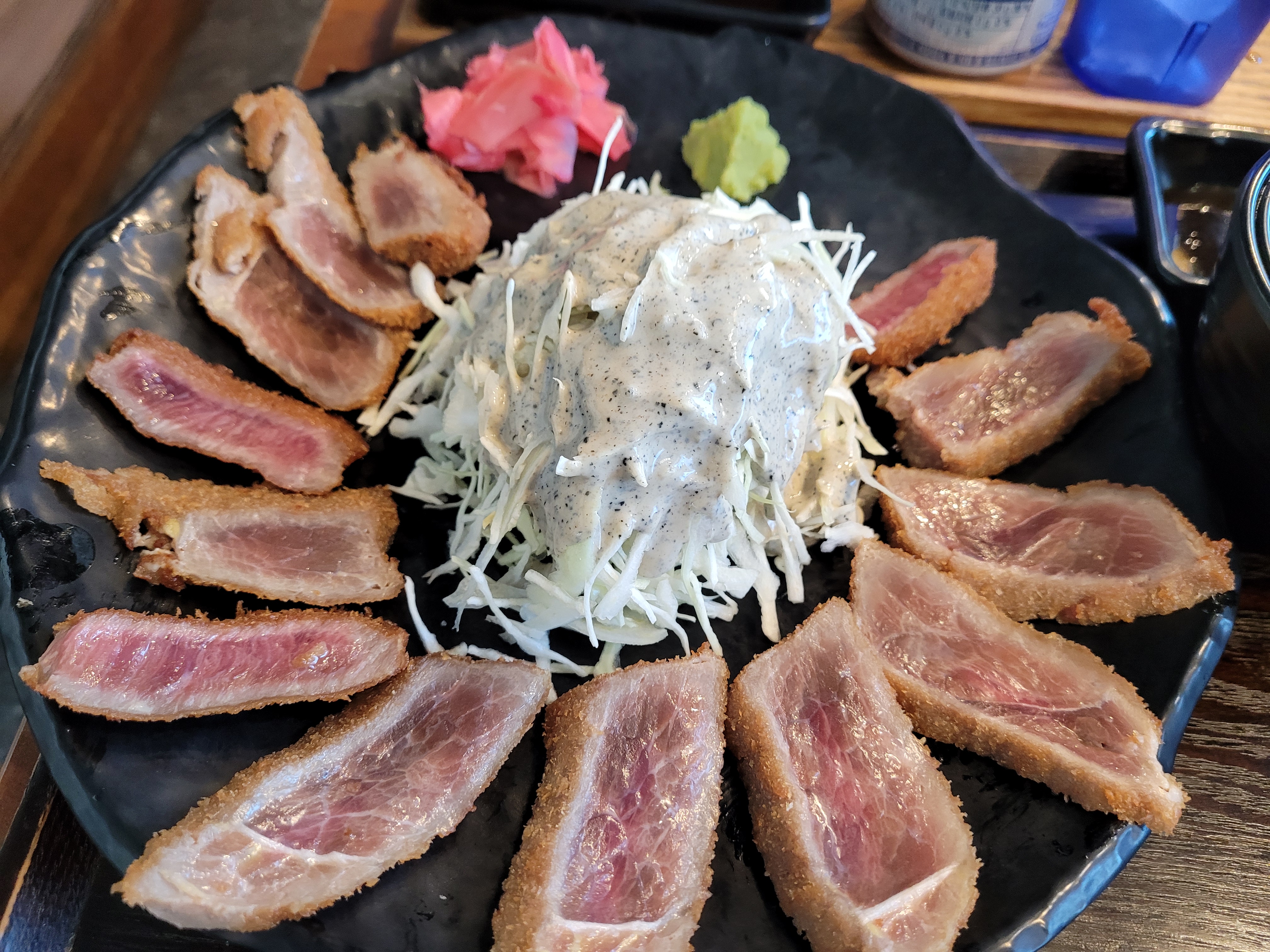 규카츠는 돈가스의 소고기 버전이라는데 여기는 소고기 채끝살을 쓰더라구요. 소고기에 빵가루로 튀김옷을 입혀 튀긴 음식이라 기본적으로 바삭하고 고소하면서 소고기여서 그런지 적당히 기름지고 부드러운게.. 식감과 맛이 정말 예술이었어요.