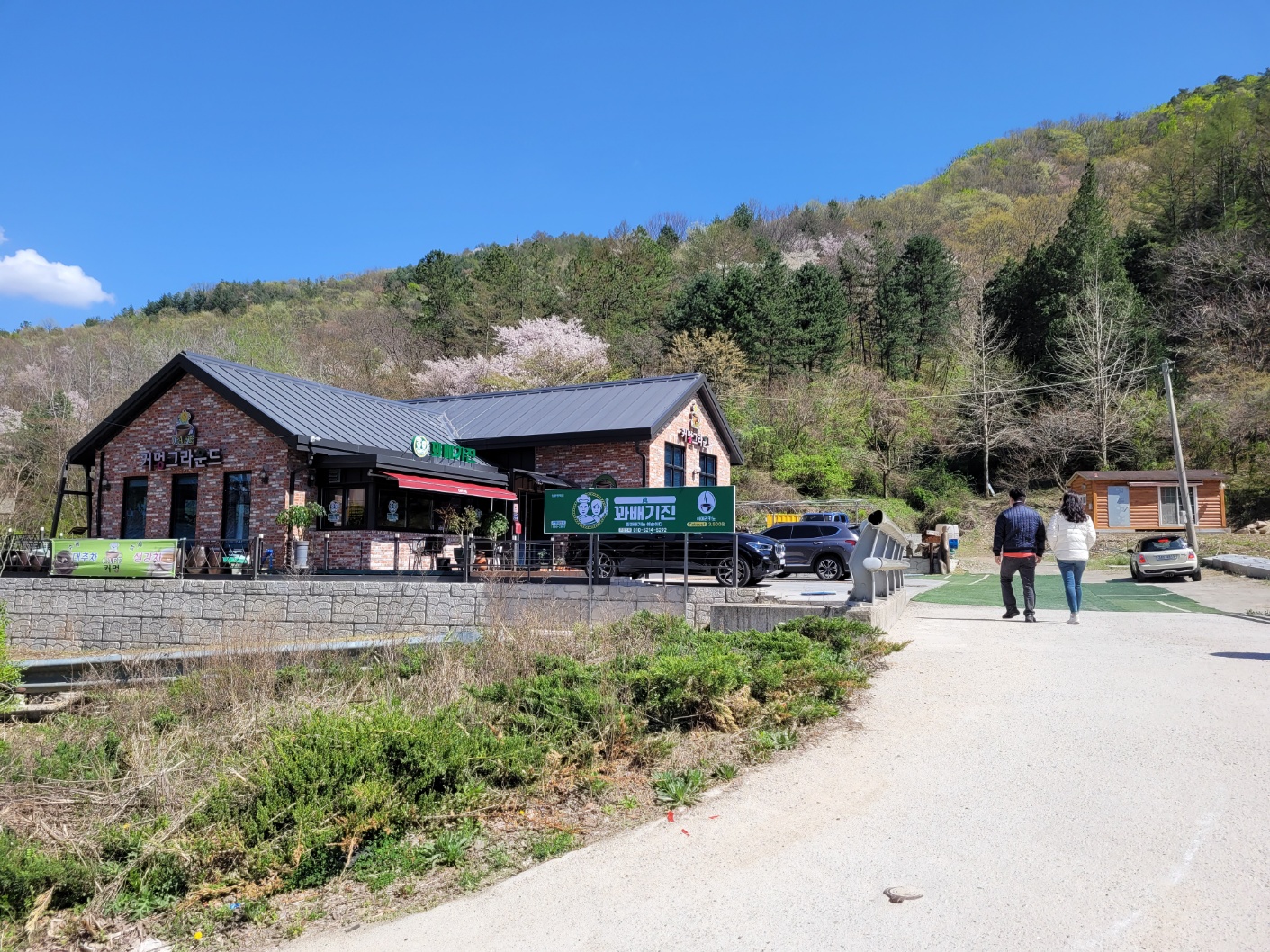 마을에 들어서면 주변에 단독주택, 팬션, 그리고 편백나무숲을 즐기는 사람들을 위한 까페가 많이 보였어요.