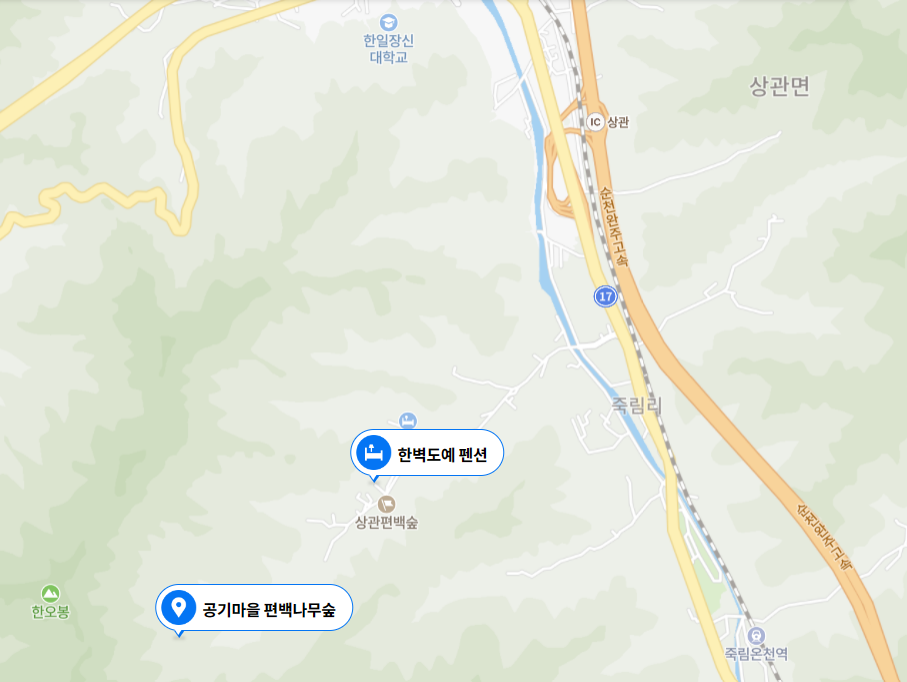 전주에서 상관쪽으로 가다보면 한일장신대학교 쪽을 지나 조금만 가다보면 상관편백숲길로 가는 길이 보여요.