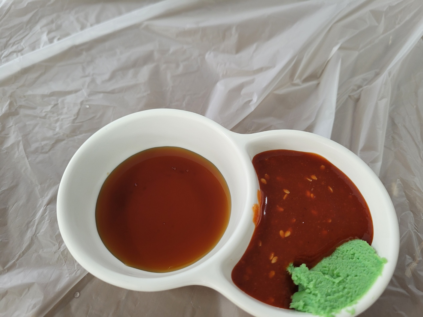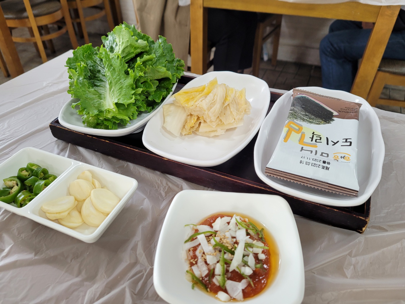 주문하자마자 소스와 밑반찬(마늘, 고추, 쌈장)이 나오고