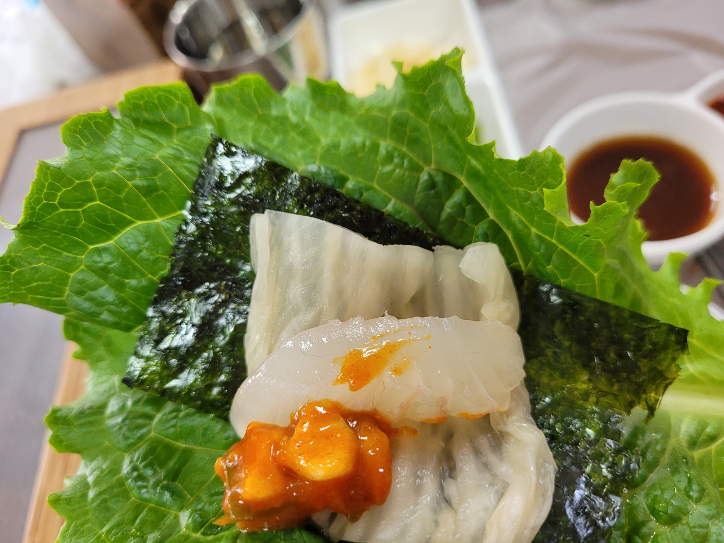 상추에 김과 백김치를 올리고 회에 쌈장소스를 올려서 먹으면~~