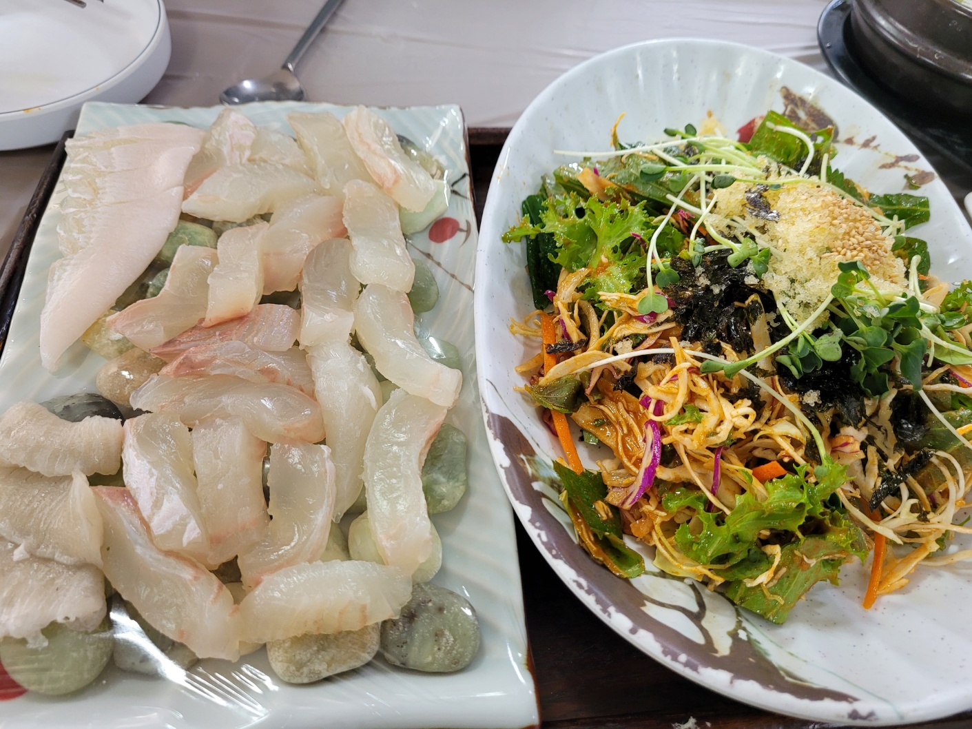 두둥~~ 메인메뉴인 광어와 날치알 듬뿍 새싹야채~~