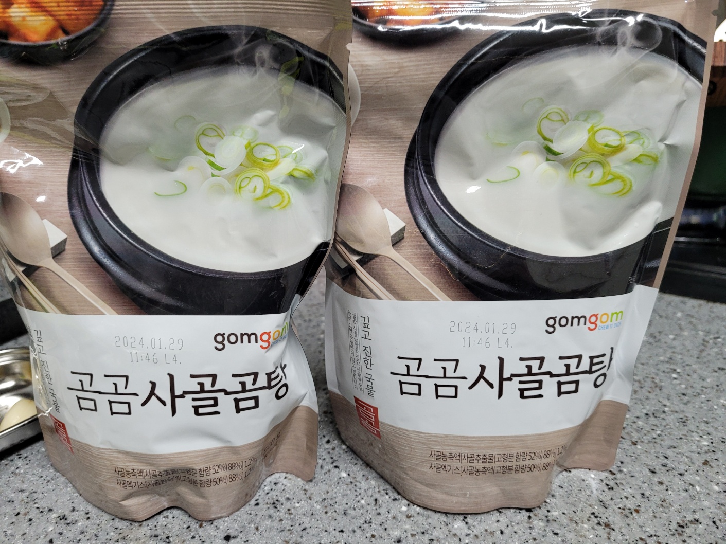 저희는 시판 사골육수가 집에 있어서 500g 짜리 2개를 넣고 물 500ml를 추가로 더 넣어주었어요.