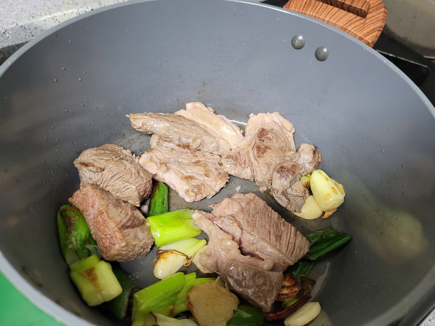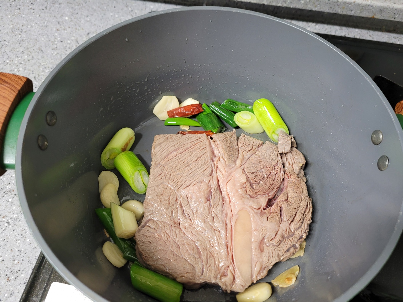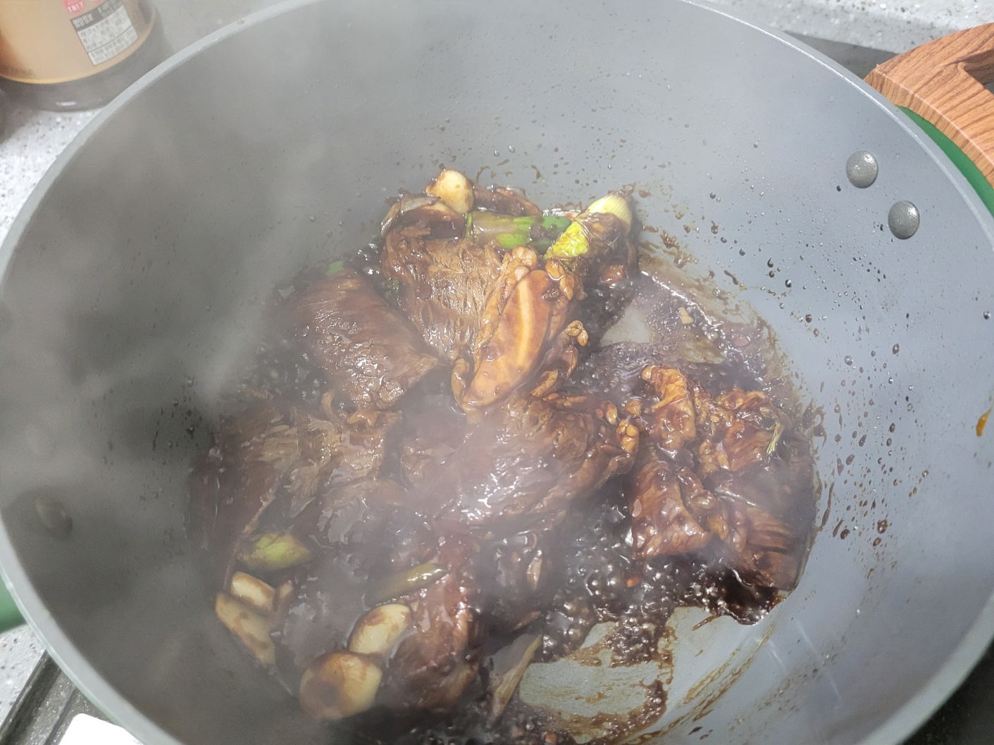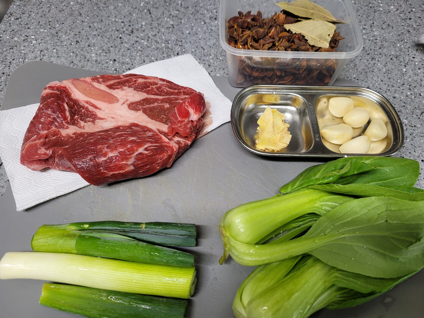 소고기 등심 400g, 통마늘 3개, 대파 1대, 생강 1개, 청경채 2개, 페퍼론치노 2개, 사골육수 500g 2개, 물 500ml, 식용유 2T, 설탕 1T, 두반장 1.5T, 양조간장 1/2 국자, 팔각 3개, 월개수잎 3장, 후추 1/2T
