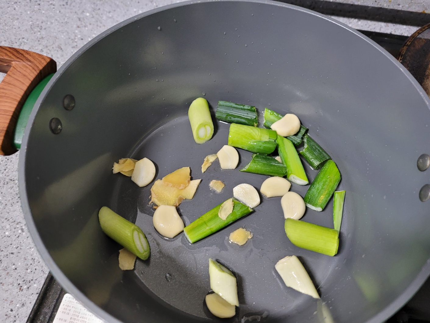 두껍고 깊은 냄비에 식용유를 두른 후 마늘, 생강, 대파를 넣고 향이 날 때까지 볶아주세요.