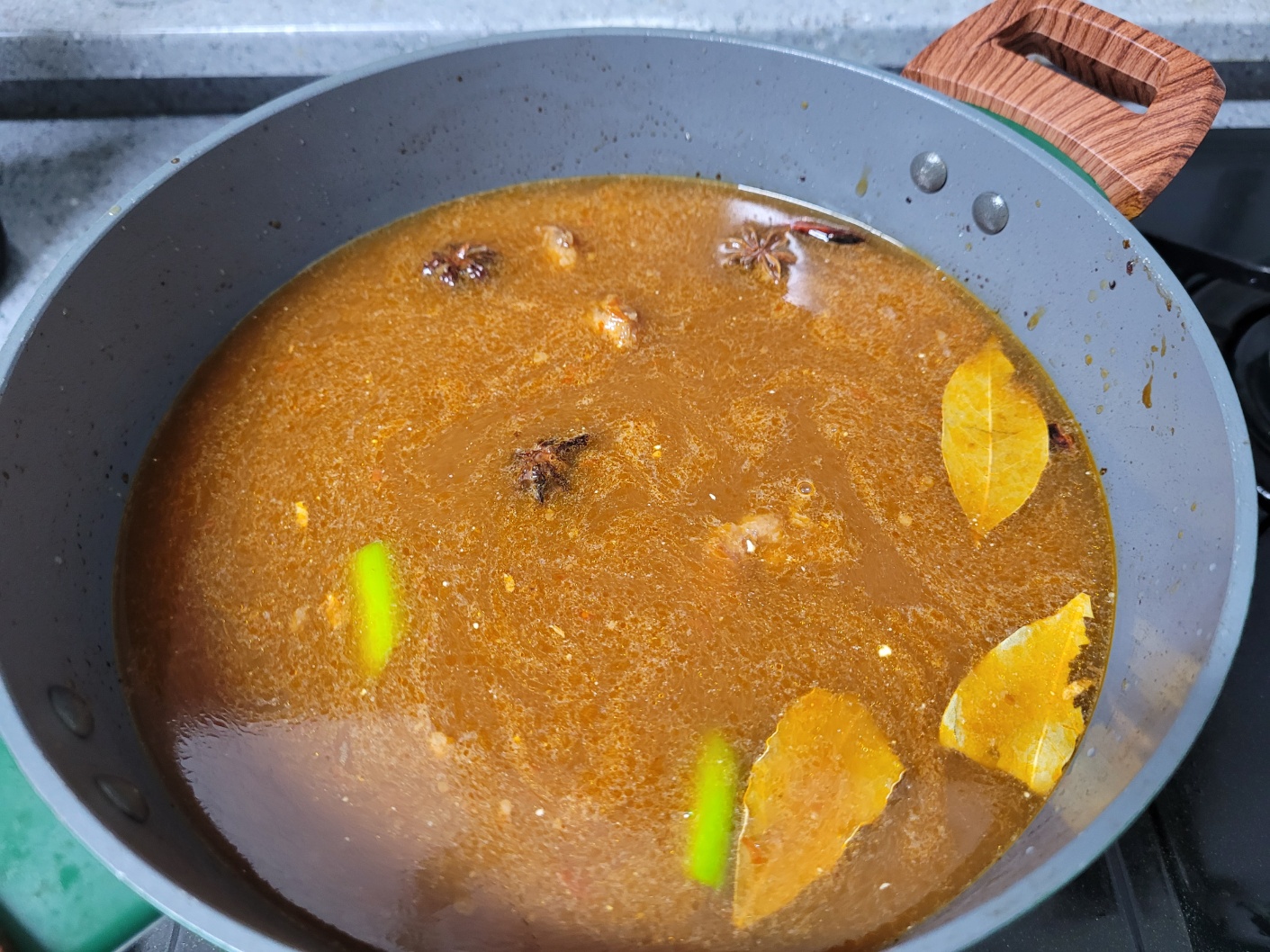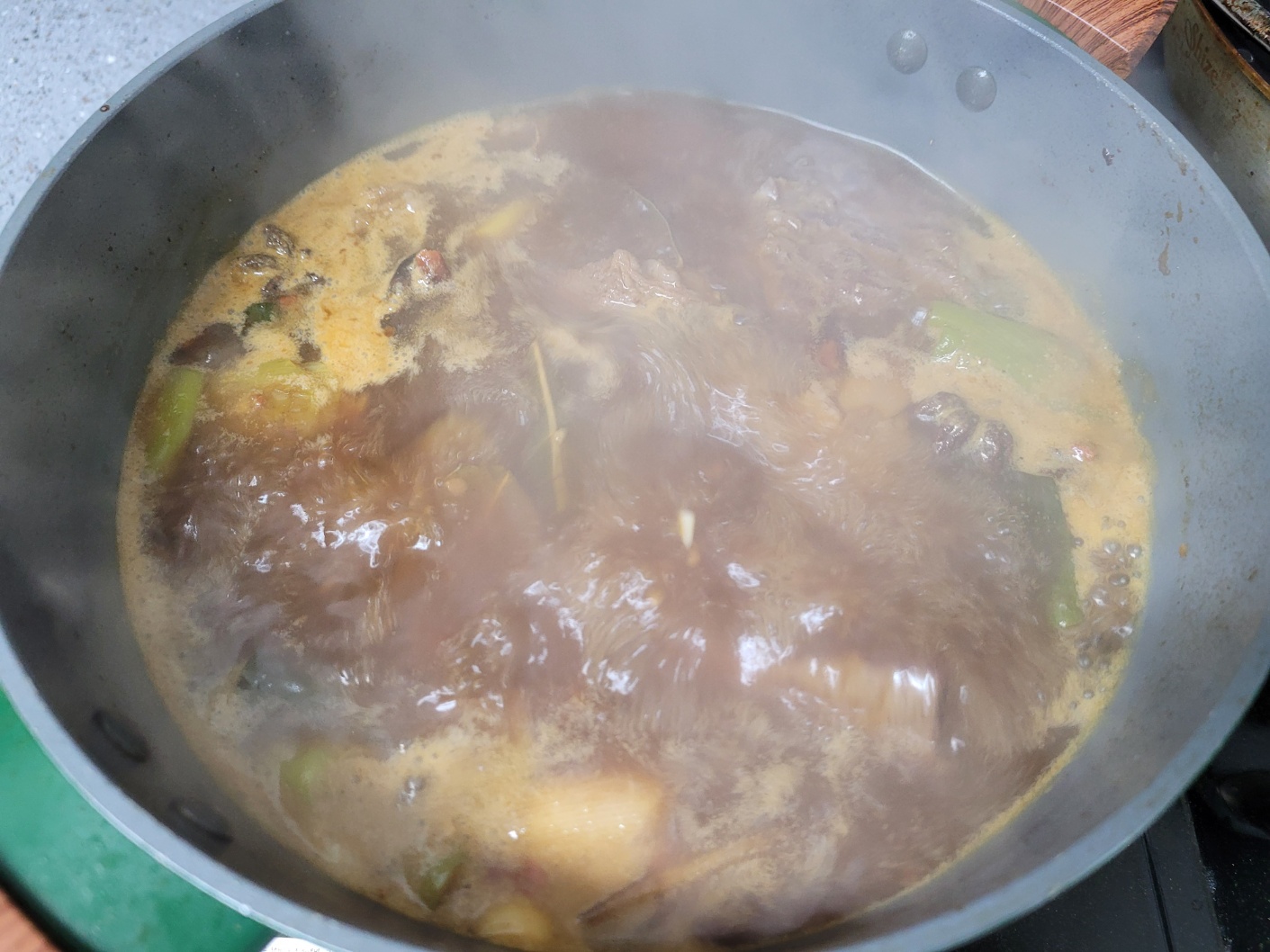여기에 팔각과 월계수잎을 넣고 후추까지 넣은 후 뚜껑을 열고 강불에서 1시간 가량 팔팔 끓여줍니다.