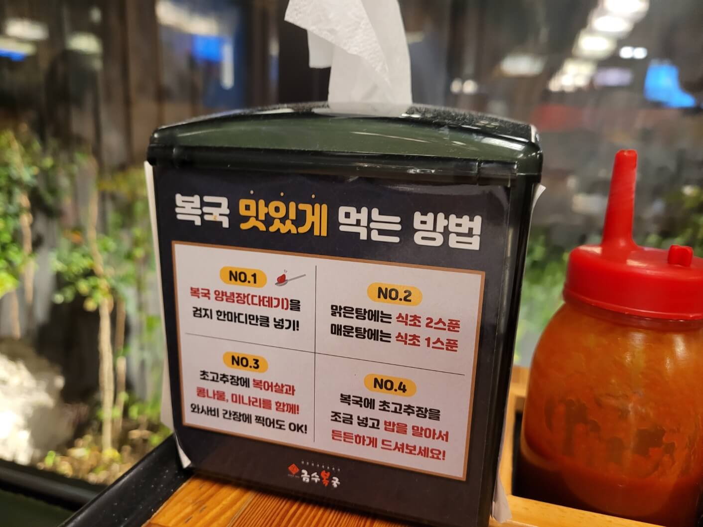 테이블에는 복국을 맛있게 먹는 방법도 나와있어요.