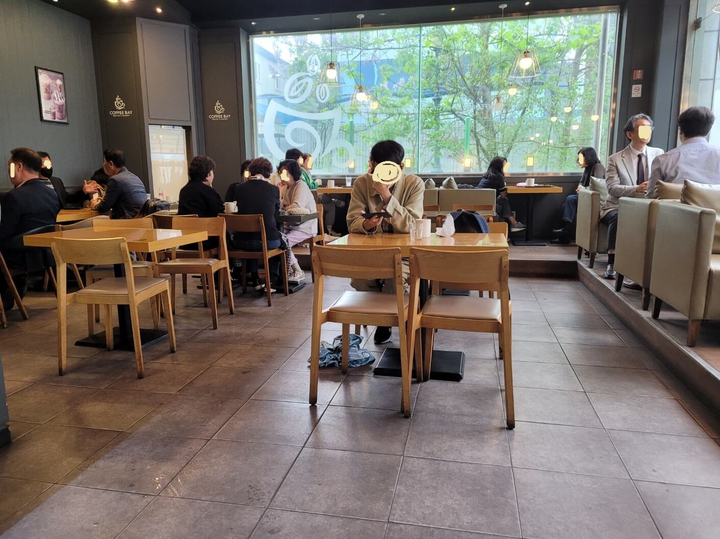 매장은 테이블이 여러 개 있고, 혼자 앉는 테이블 4명 이상 앉는 테이블, 2인 테이블 등 테이블이 많이 있어요.
