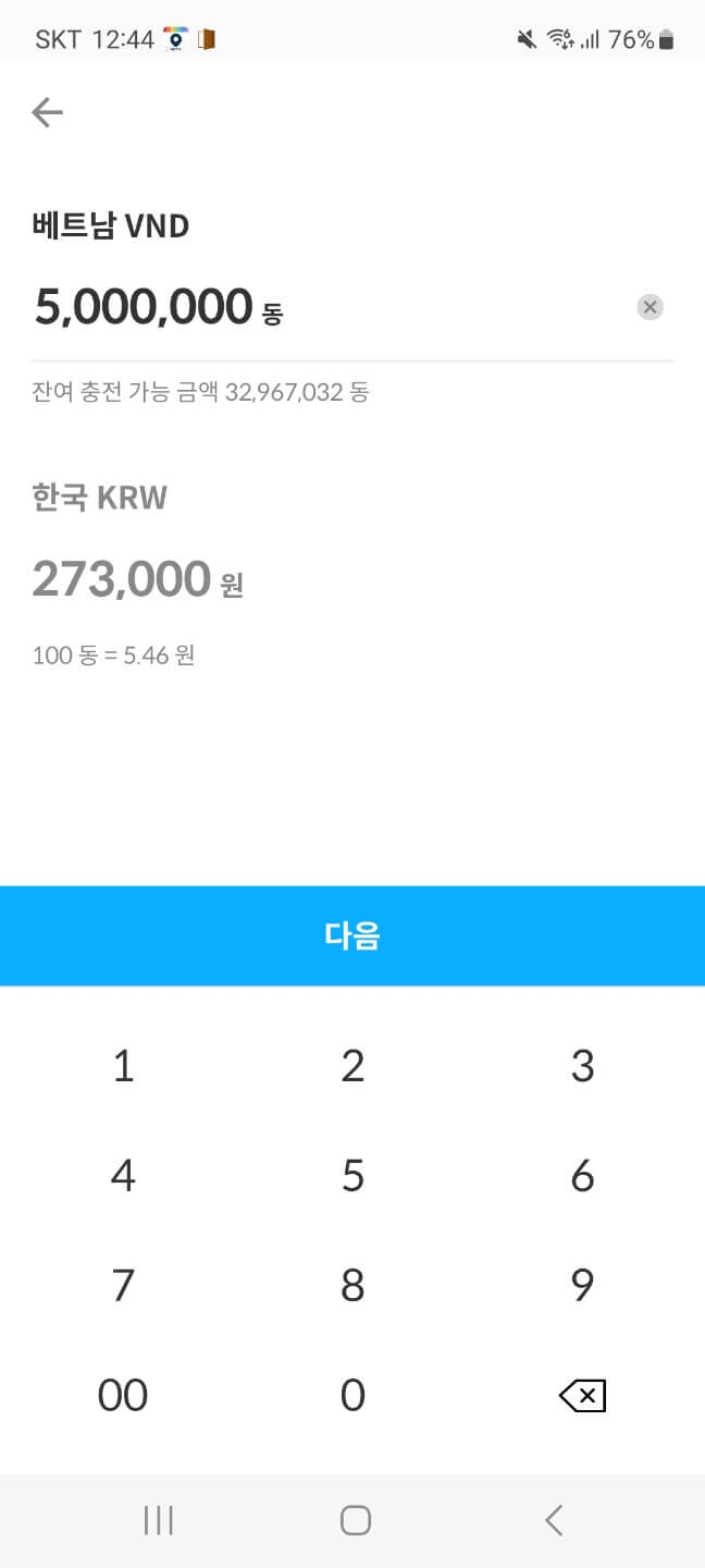 다음을 클릭하면 연동된 계좌에서 수수료없이 환율 반영해서 돈이 인출되고 트래블월렛 앱에는 충전금액이 표시됩니다.
