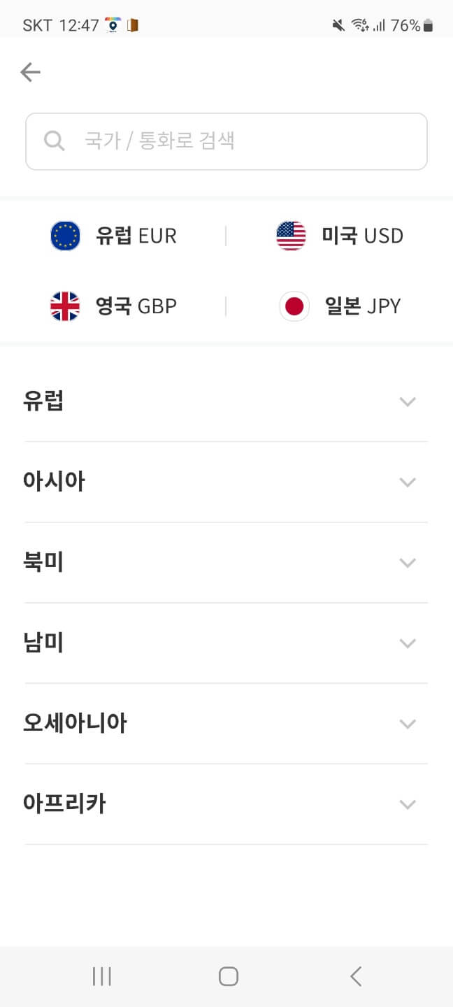 그럼 환전 할 국가를 선택하는 창이 나옵니다. 여행 갈 국가를 검색해주세요.
