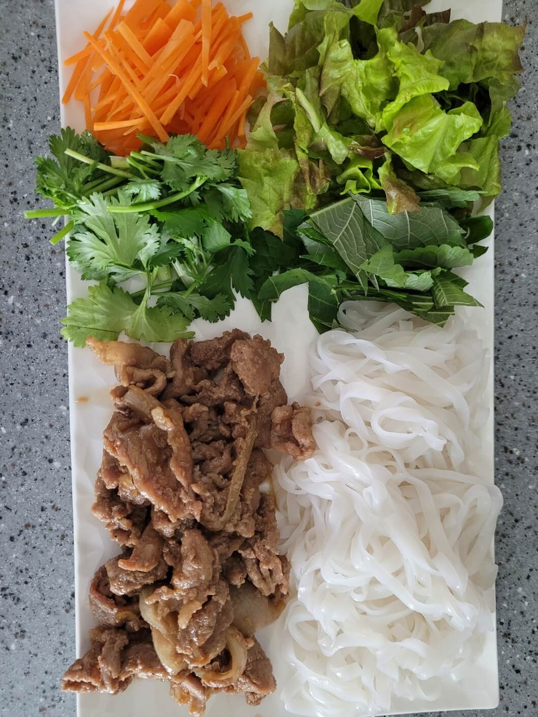 접시에 준비 해놓은 채소, 쌀국수면, 고기를 올리고 느억맘 소스와 함께 내놓으면 끝!!