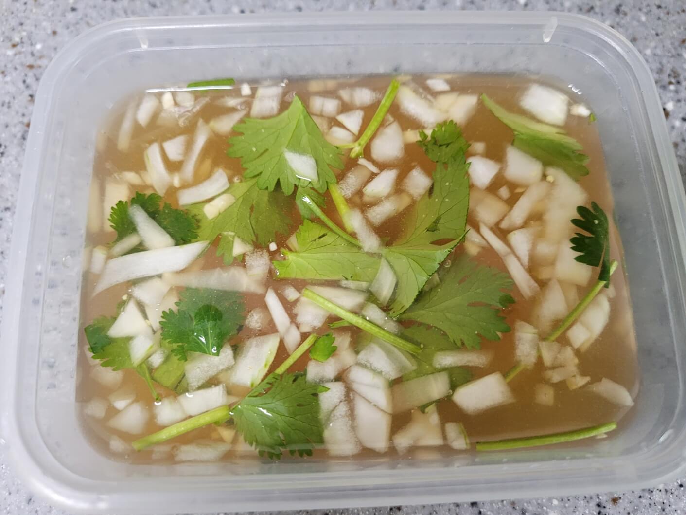 물 300ml, 피시소스 3T, 식초 1T, 레몬즙 3T, 양파 1/4개 크게 다진 거, 다진마늘 1T, 당근 1/5개 동그랗고 얇게 썬 거, 고수 & 청양고추는 쫑쫑 썰어 취향껏,