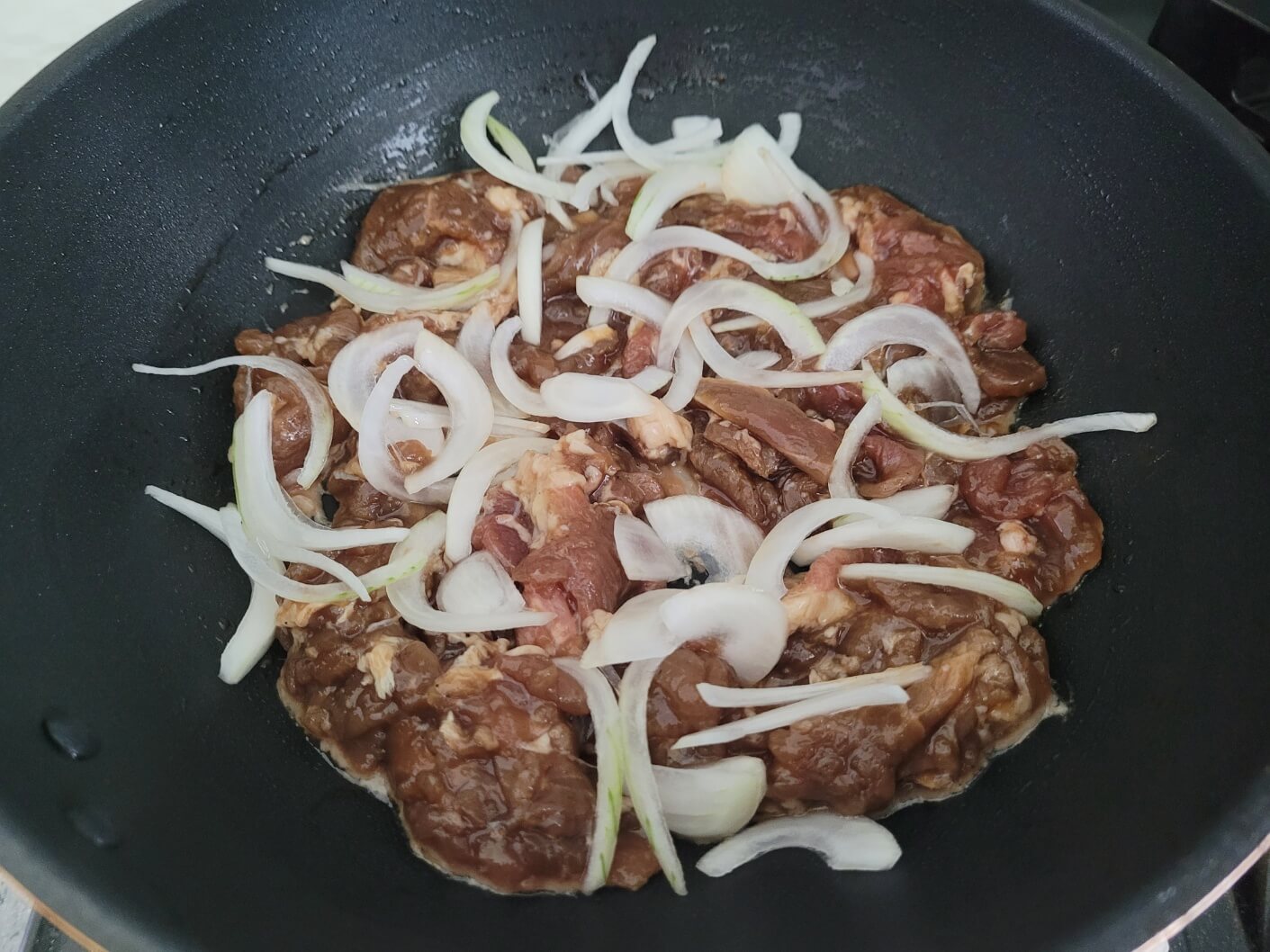 재워놓은 불고기를 팬에 구워주세요.