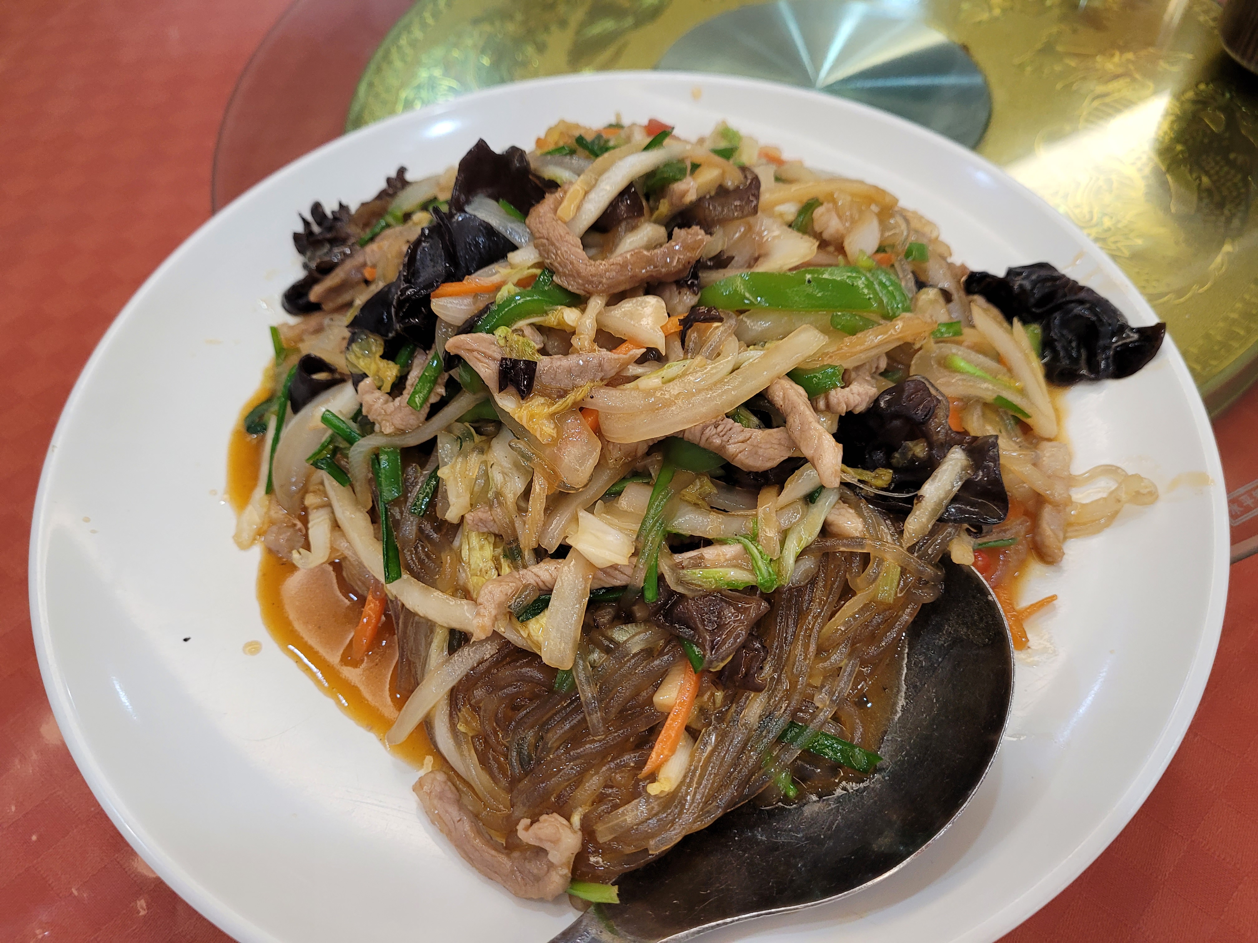 잡채는… 약간 매콤하면서 기름기가 좀 많고 불 맛이 조금났어요.