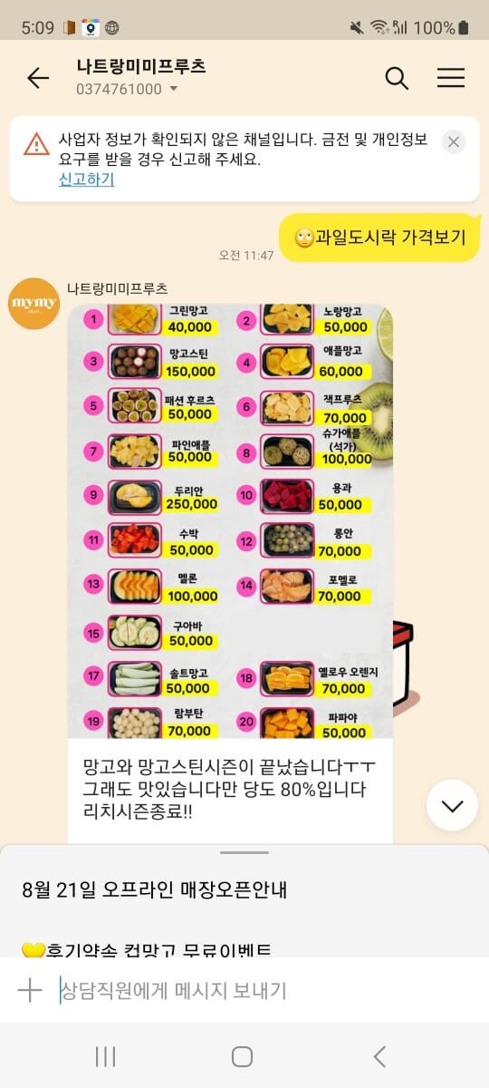 저희는 두리안 1팩, 그린망고 1팩, 잭푸르츠 1팩을 주문했고 배달비까지 410,000동 한화로 약 22,000원 정도 지불했어요.