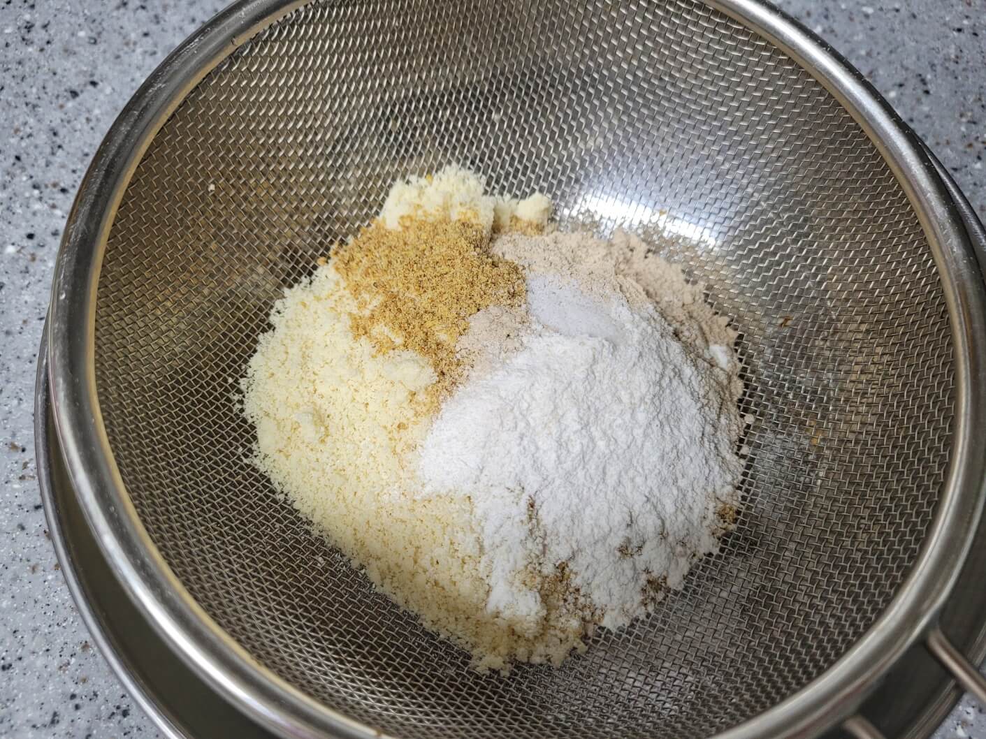 가루들을 볼에 넣고 체에 걸러 잘 섞어주세요.
