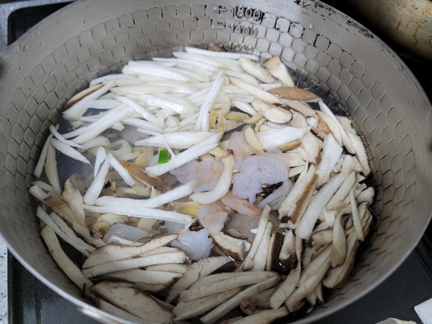 불린 해삼, 표고버섯, 죽순은 채 썰고 팽이버섯 1/2개, 새우는 끓는 물에 데쳐 물기를 빼주세요. 저는 참고로 해삼과 죽순은 없어서 이 과정은 생략했어요. 해삼대신 목이버섯 사용도 추천해주셨어요.