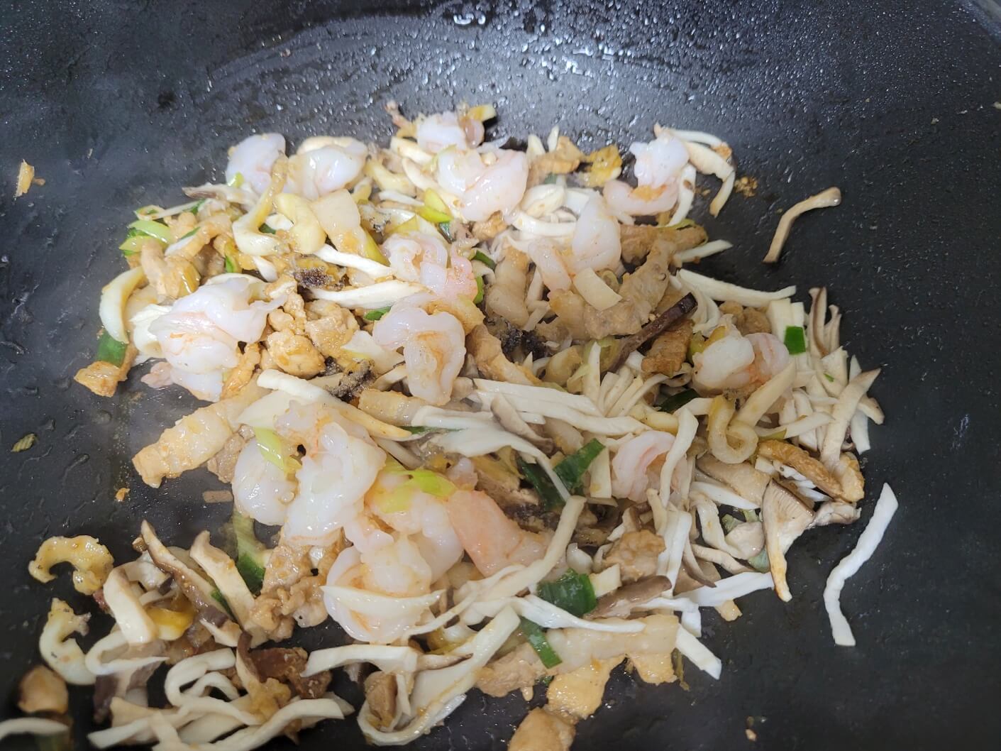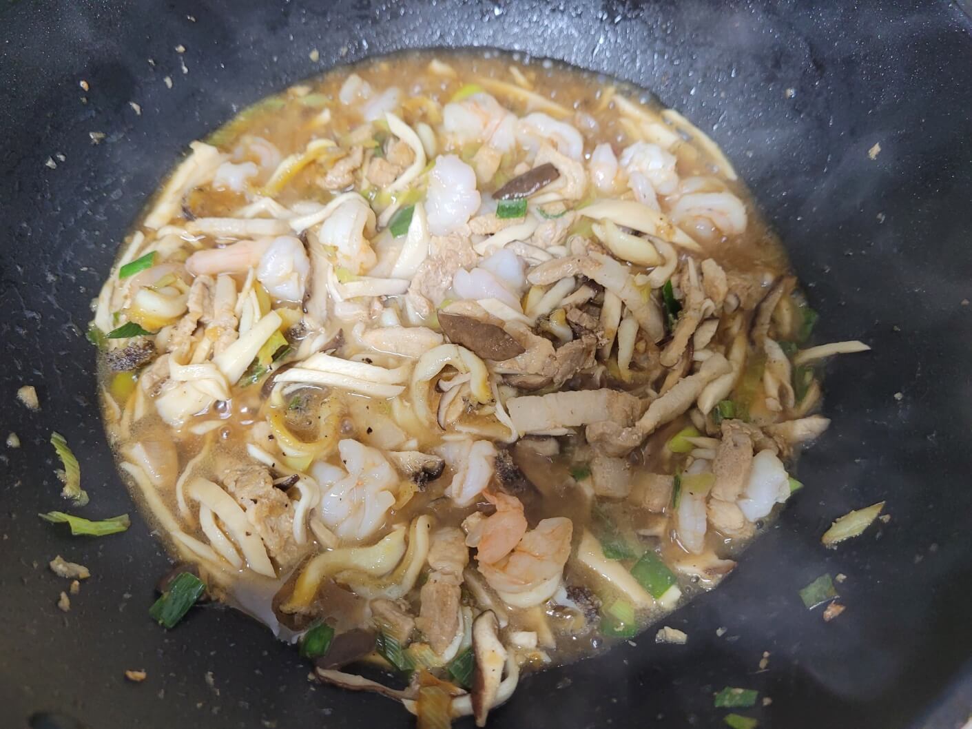 돼지고기채 50g, 불린해삼 80g, 새우 5마리, 팽이버섯 1/2개, 표고버섯 4개, 죽순 1/2개, , 식용유 1컵, 다진 대파 1줌, 다진 생강 1t, 다진마늘 1T