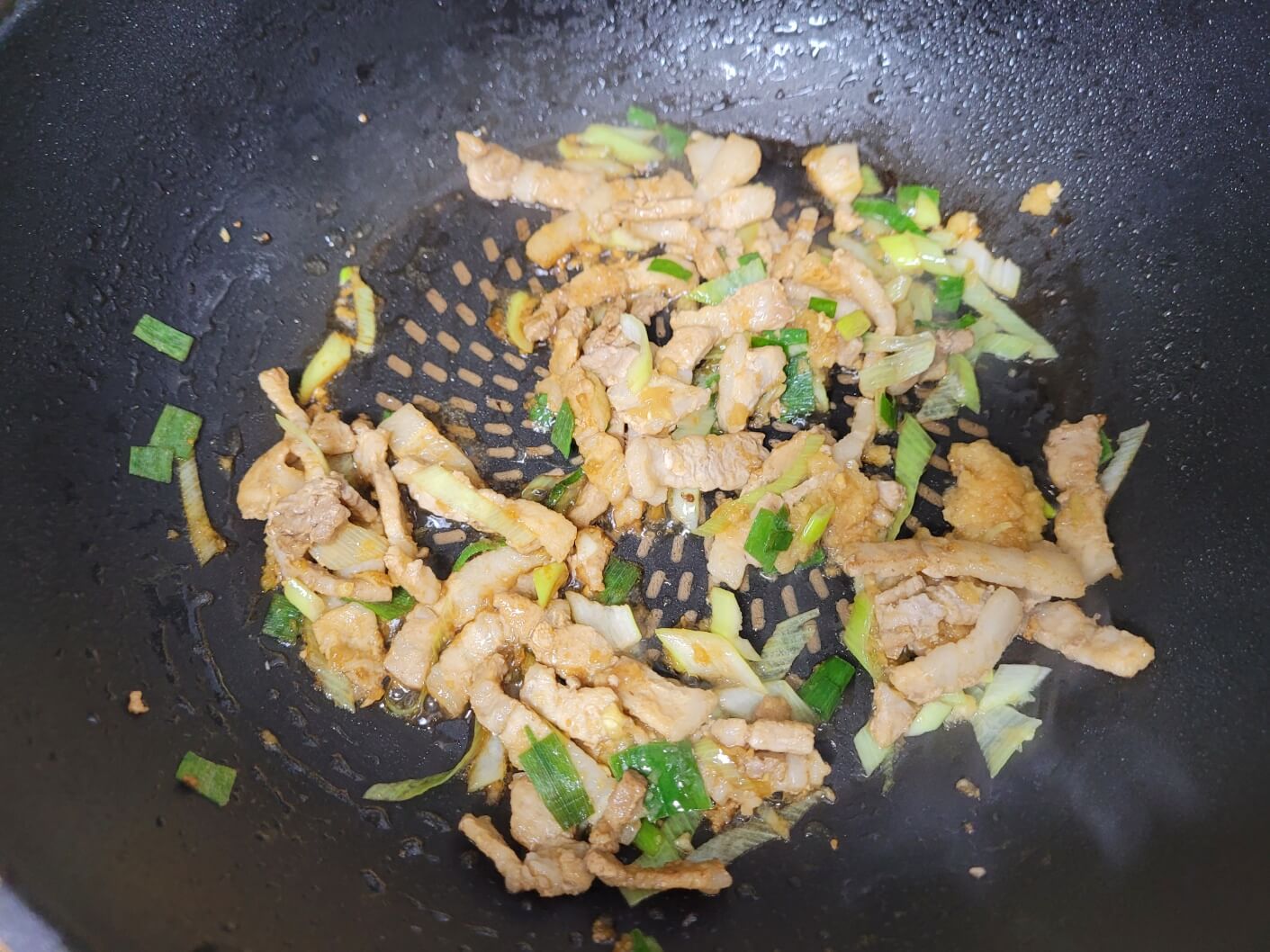 여기에 간장 1/2T를 더 넣어서 파가 살짝 숨이 죽을 때까지 볶아주세요.