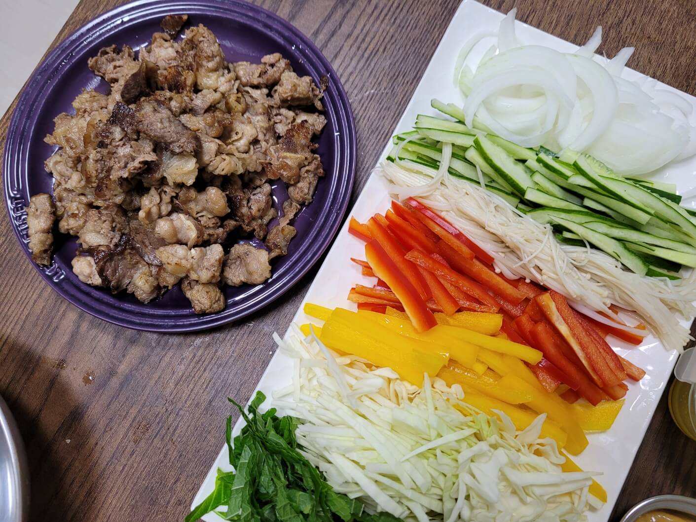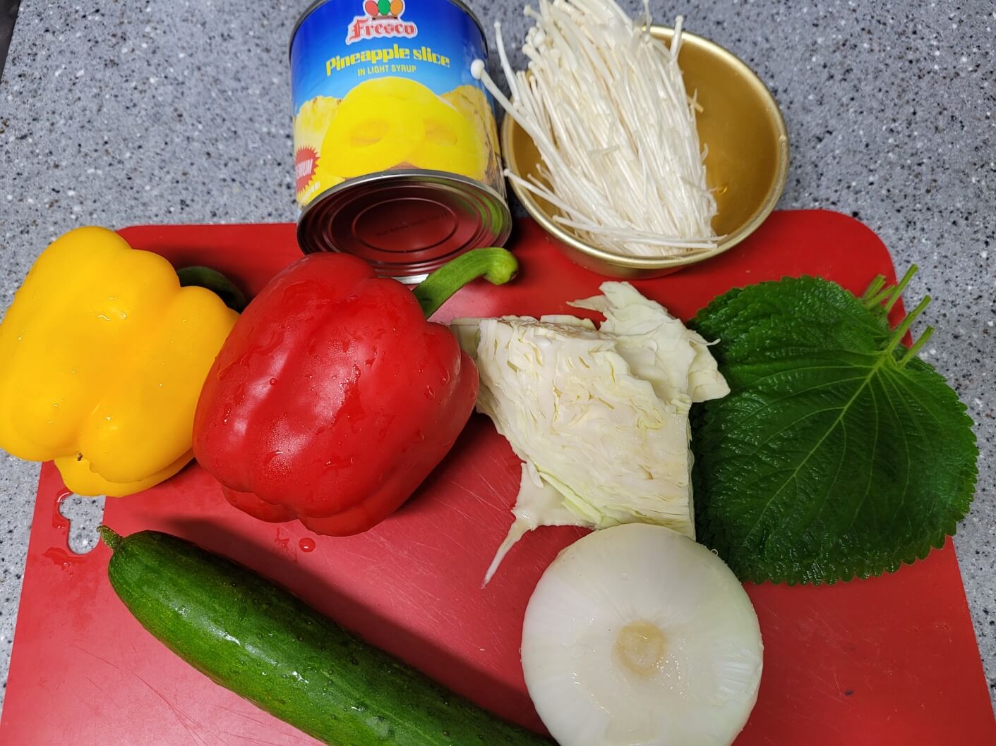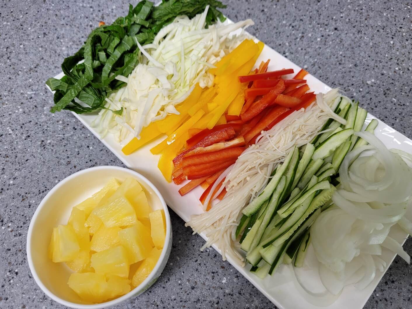 우삼겹 400g, 파프리카 빨강 1개, 노랑 1개, 오이 1/2개, 양파 1/2개, 양배추 1줌, 깻잎 15장, 파인애플 통조림 200g, 팽이버섯 1봉, 라이스페이퍼