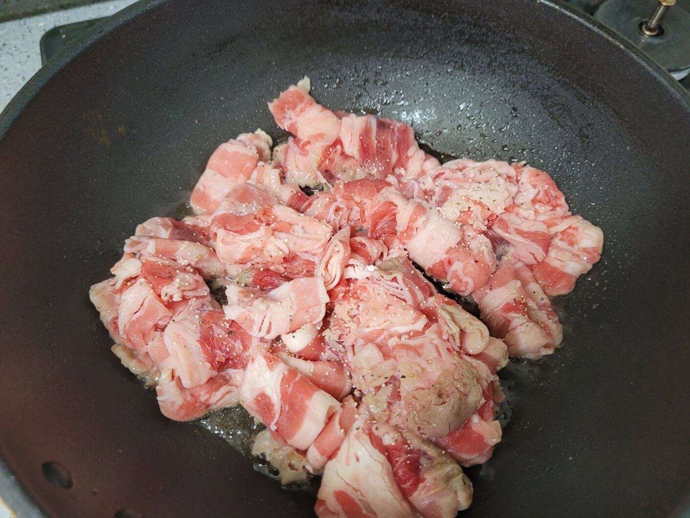 팬을 달군 후에 우삼겹을 넣고 볶아주세요. 간은 소금과 후추로만 했어요.