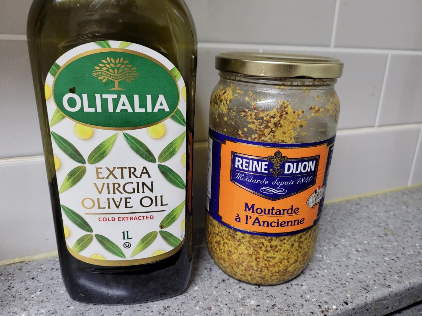 - 소금 2꼬집, 후추 약간, 엑스트라 버진 올리브오일 2TB, 디종머스터드 듬뿍 1tb 넣으세