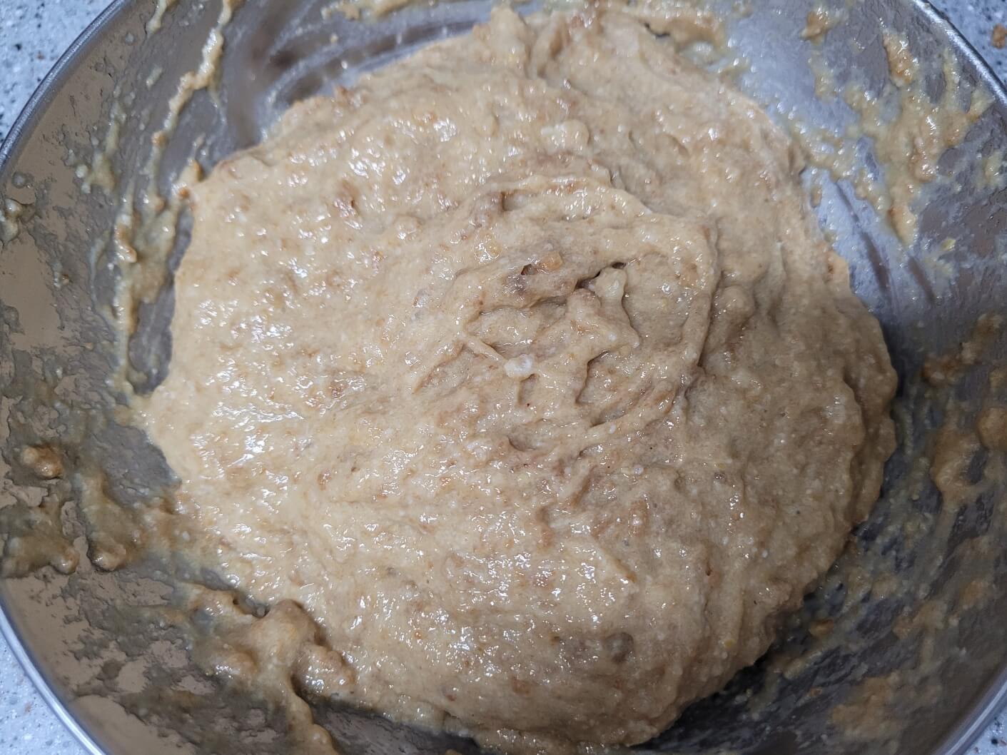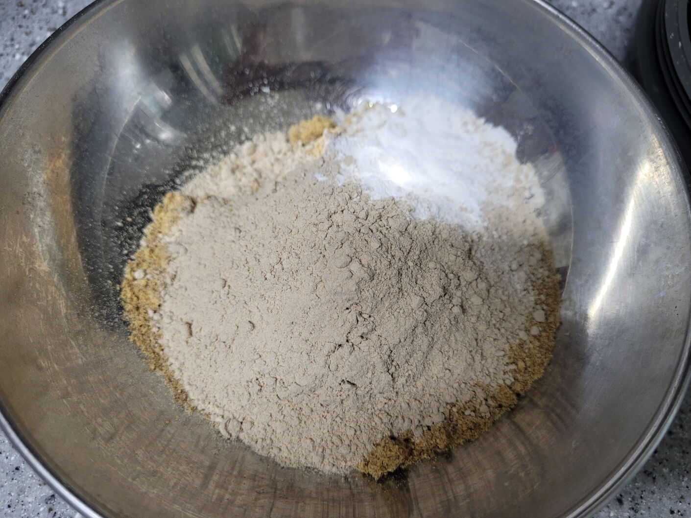 코코넛 가루(코코넛 플라워) 40g, 차전자피가루 32g, 플렉씨드 밀(아마씨가루)36g, 소금 1g 미만, 베이킹파우더 5g, 달걀 235g(4개 분량), 뜨거운 물 153g, 식초 15g, 올리브유 20g