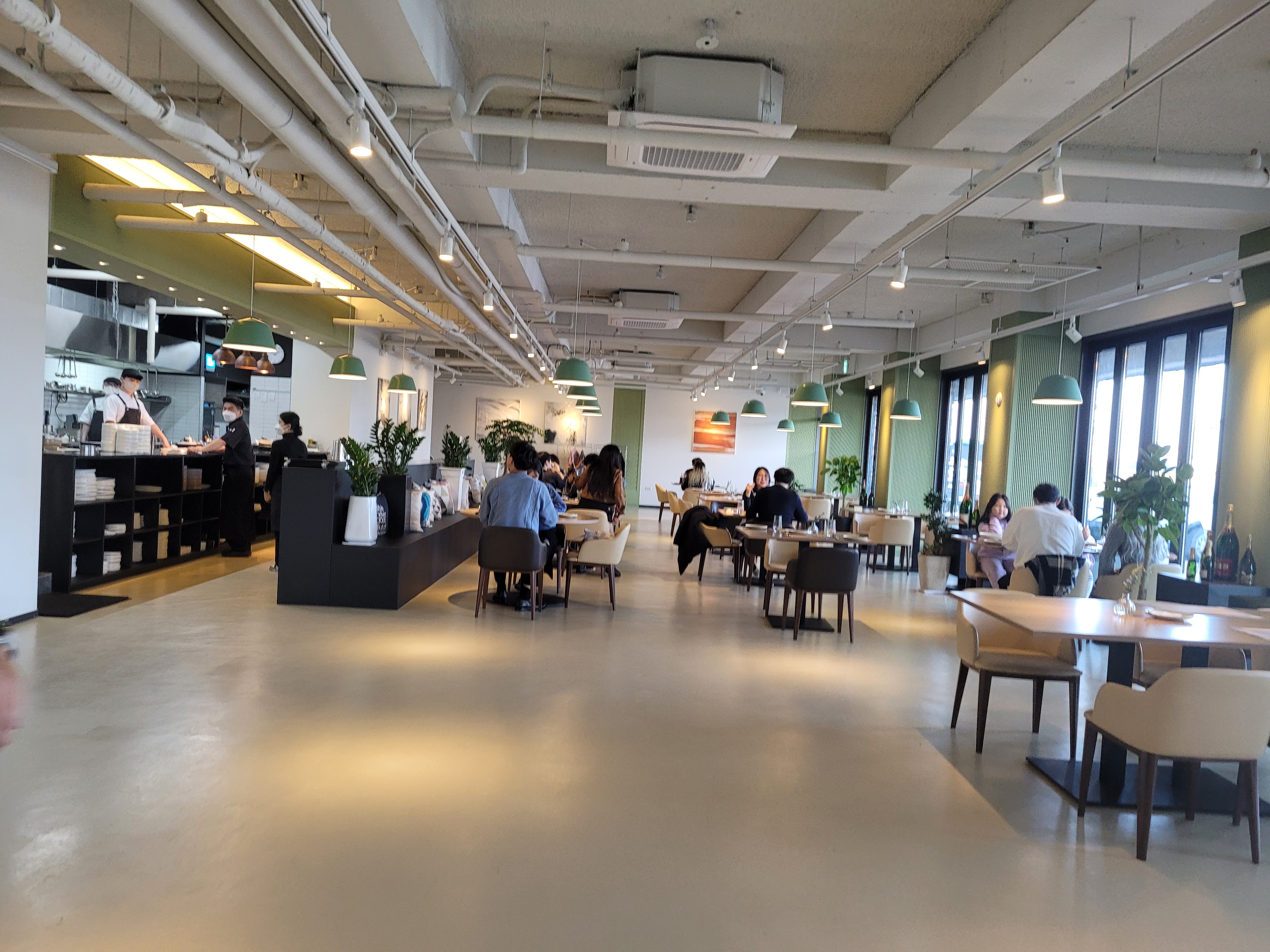 내부는 전반적으로 화이트 인테리어에 밝은 느낌이고 탁 트인 공간에 테이블이 널찍히 세팅되어 있으며 오픈형 주방이 깔끔하고 신뢰가 가더라구요.