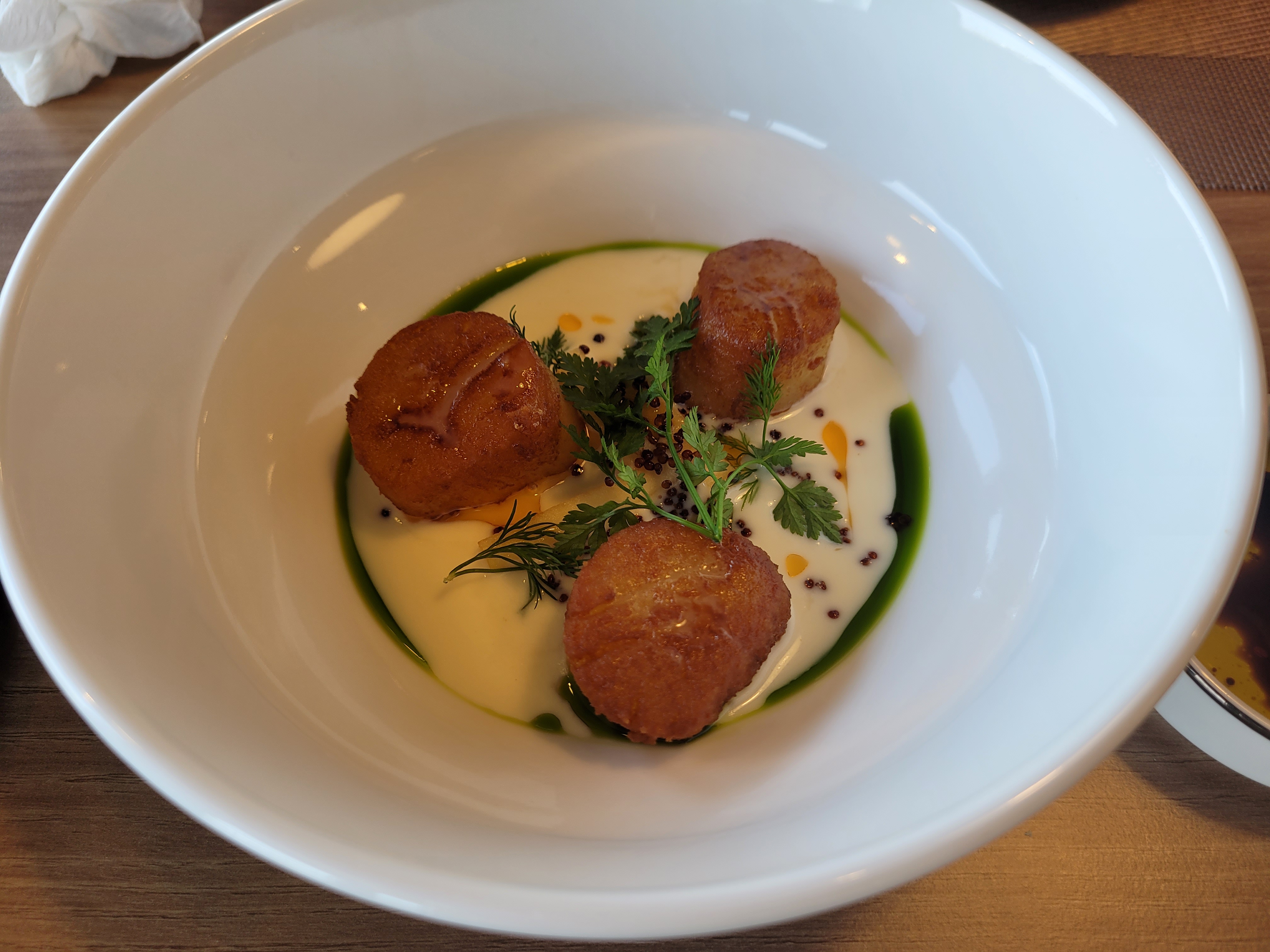 (팬에 구운 관자와 클램차우더 소스, 오늘의 스프, 해산물 비스큐 링귀니 파스타 선택)