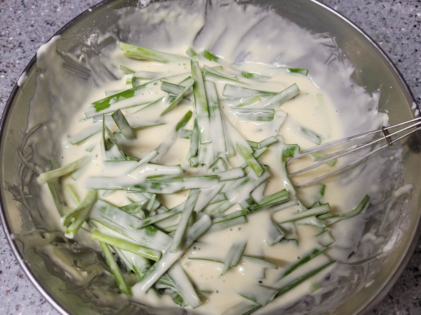 반죽에 부추를 넣고 풋내가 나지 않도록 살살 섞어주세요.