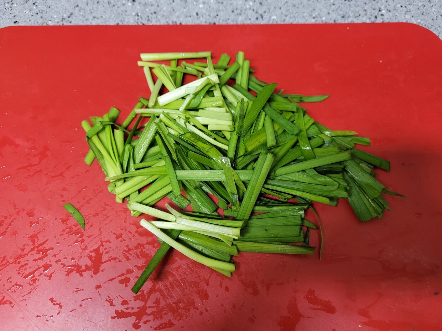 부추를 깨끗하게 씻어서 먹기 좋은 크기(4~5cm, 손가락 두마디 정도)로 썰어서 준비해주세요.