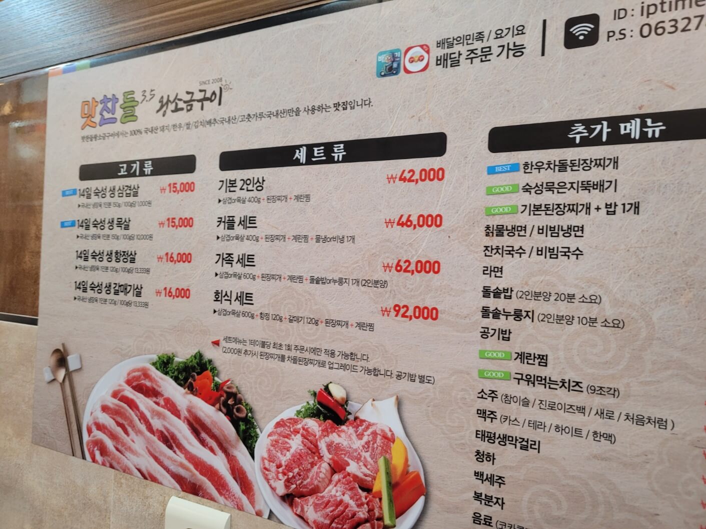 메뉴는 다음과 같아요. 저희는 4인이어서 가족세트에서 삼겹살 300g, 목살 300g 으로 주문했어요.