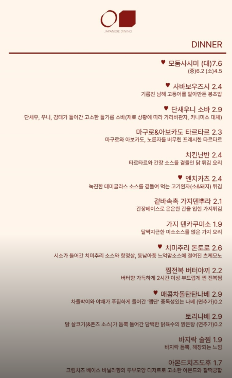디너메뉴는 더 다양하지만 안주에 가까운 메뉴인거 같아요.