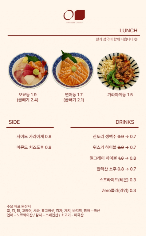 저희는 점심시간에 방문했고 모두 카이센동에 해당하는 오묘동과 사이드 가라아게를 시켰어요.