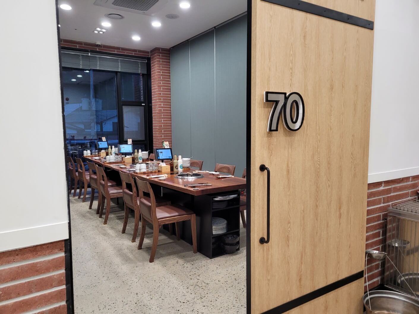 2층 식사장소는 엘리베이터를 기준으로 왼쪽은 테이블석이고 오른쪽에는 룸들이 있어요.