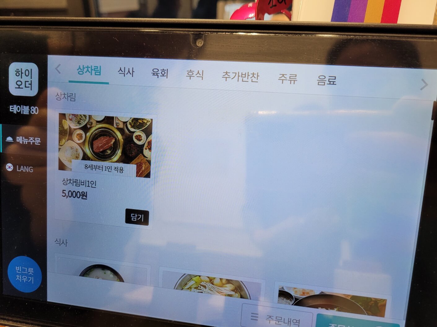 각 테이블마다 태블릿이 있어서 여기서 상차림을 인당 추가하고 나머지 음료나 사이드메뉴도 주문하실 수 있어요.