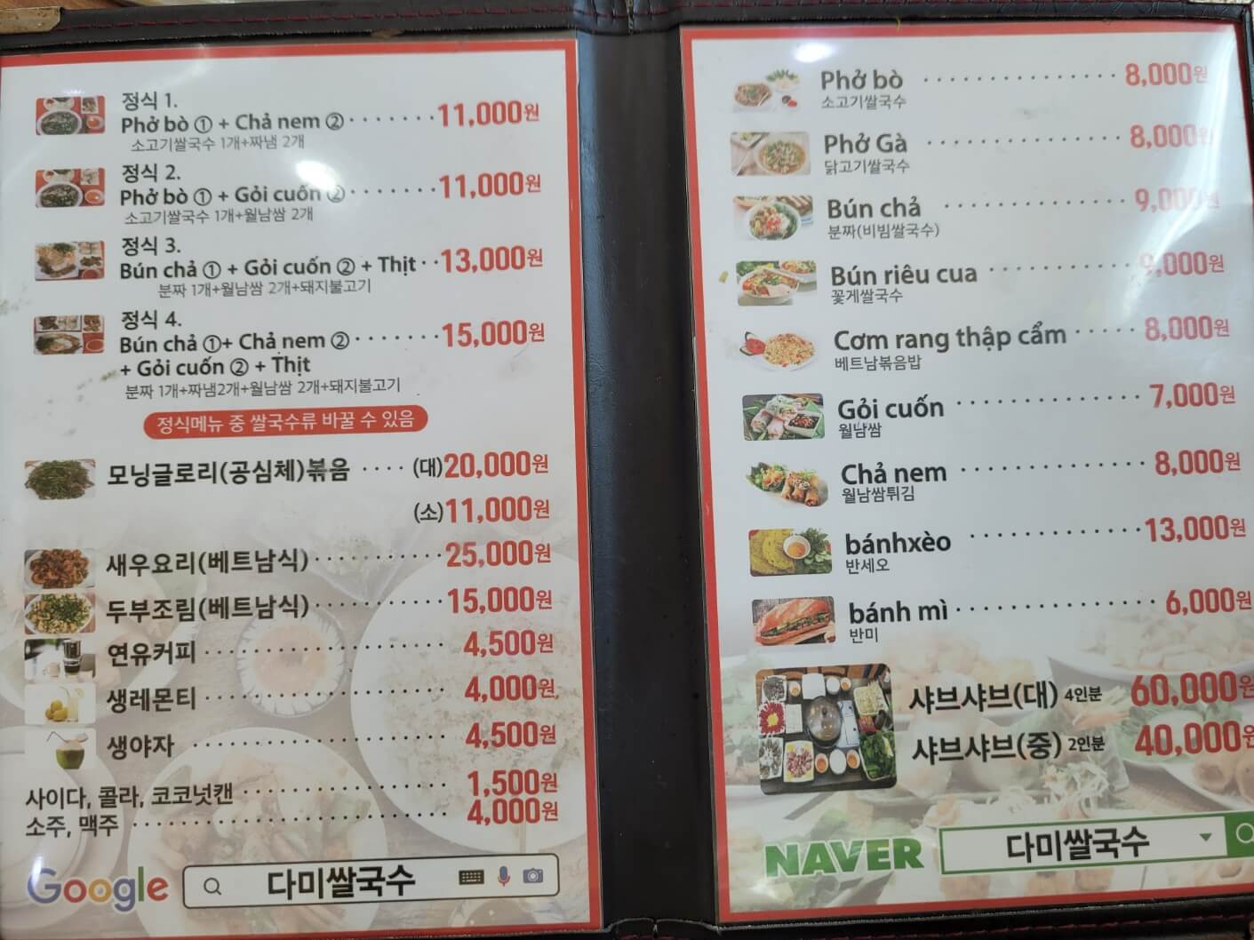 메뉴도 쌀국수, 분짜, 월남쌈, 넴느엉을 포함해 다양했으며 하노이식 뿐만 아니라 남부스타일로 가미된 다양한 쌀국수가 메뉴에 있었어요.