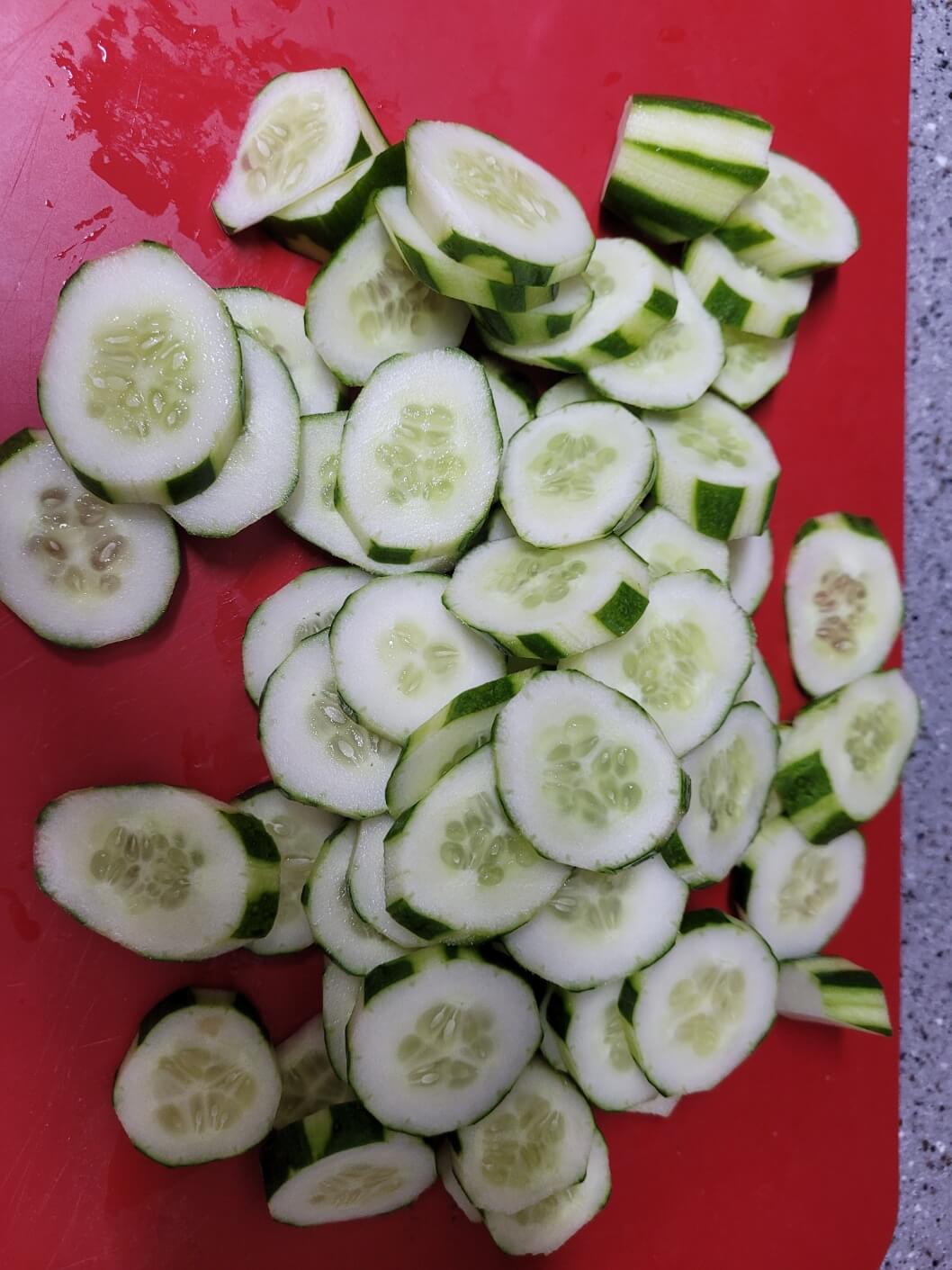 오이를 1.5cm 크기 정도로 잘라주신 뒤 그릇에 넣어주세요.