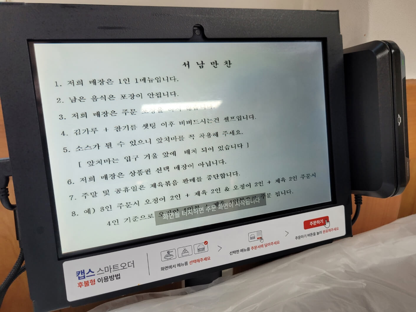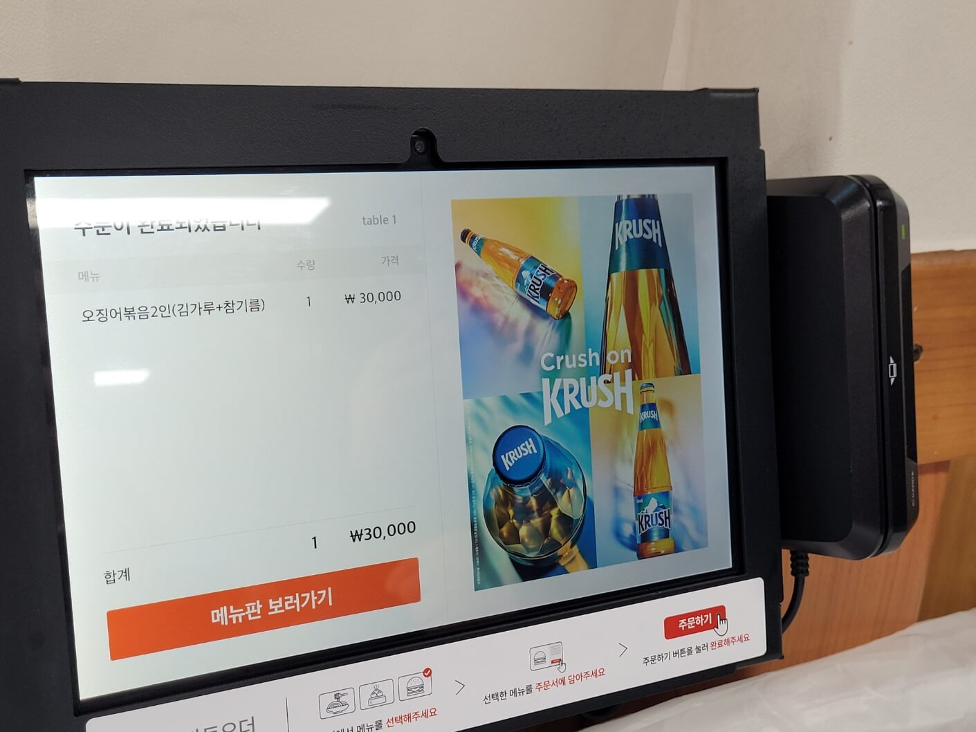 가게는 신발을 벗고 들어가는 입식 테이블이고 테이블마다 주문을 할 수 있는 스크린이 있어서 메뉴 주문과 결재까지 가능해요.