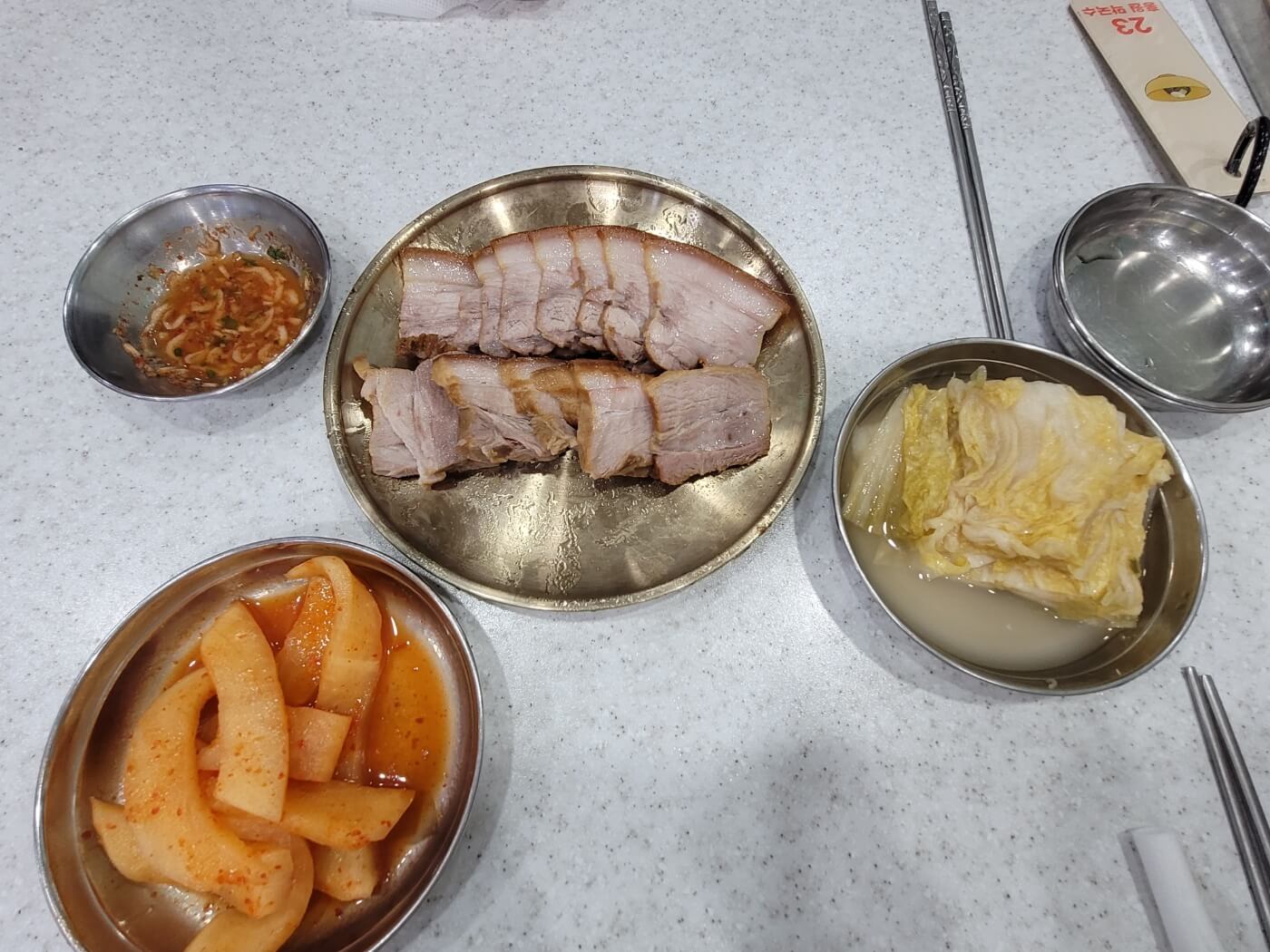 기본적으로 주전자에 온육수와 무김치가 제공되며 편육을 시켜서 백김치와 새우젓도 함께 주셨어요.
