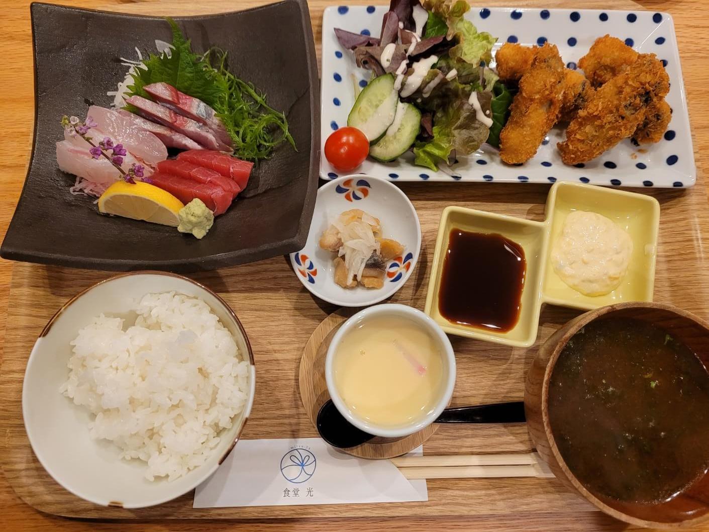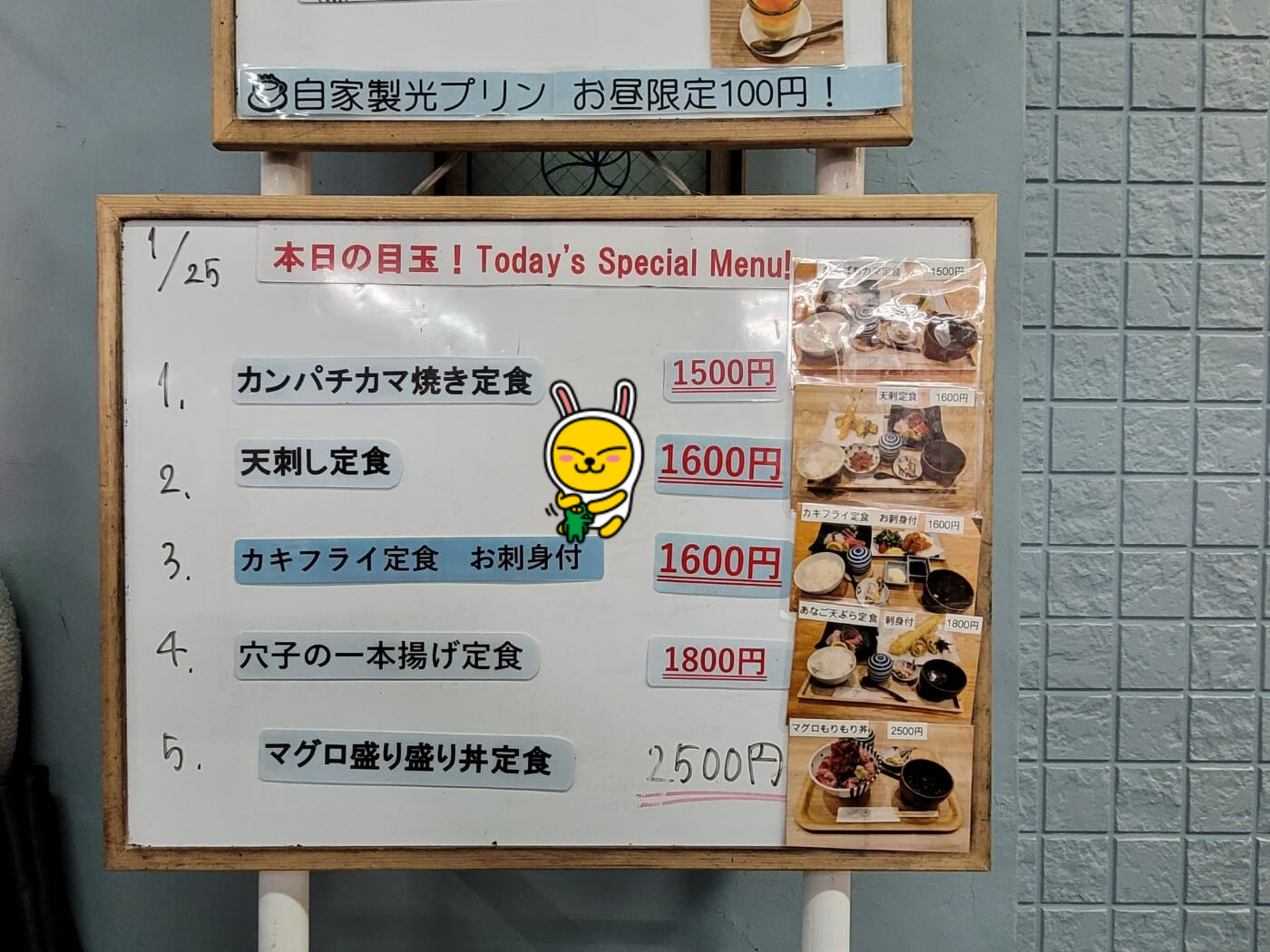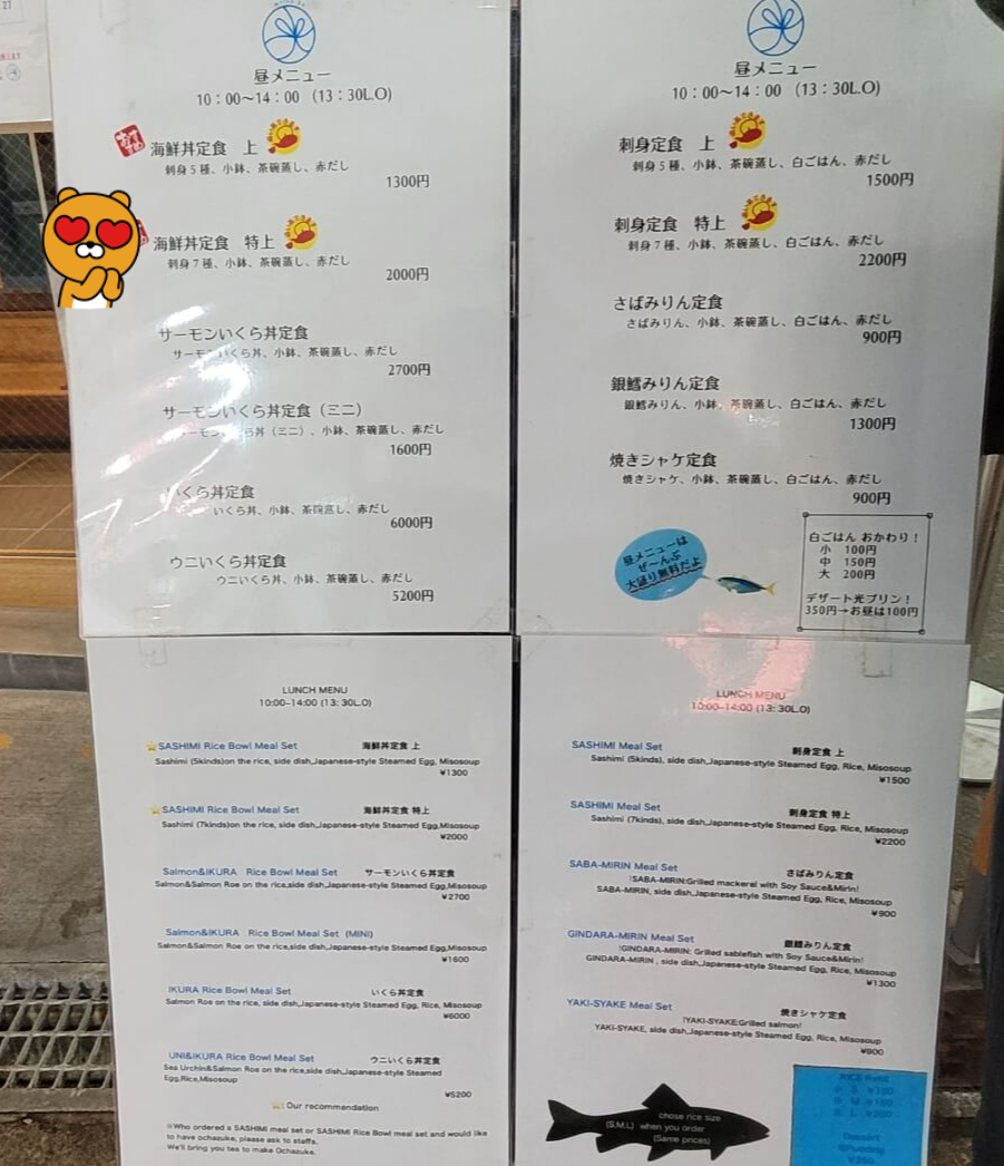 - 저희는 카이센동 특상 1개(2,000엔), 오늘의 메뉴 중에서 3번째에 있는 회+굴튀김 정식(리키후라이) 1개 1,600엔 으로 주문했어요. 밥은 소, 중, 대 중에서 고르실 수 있어요.