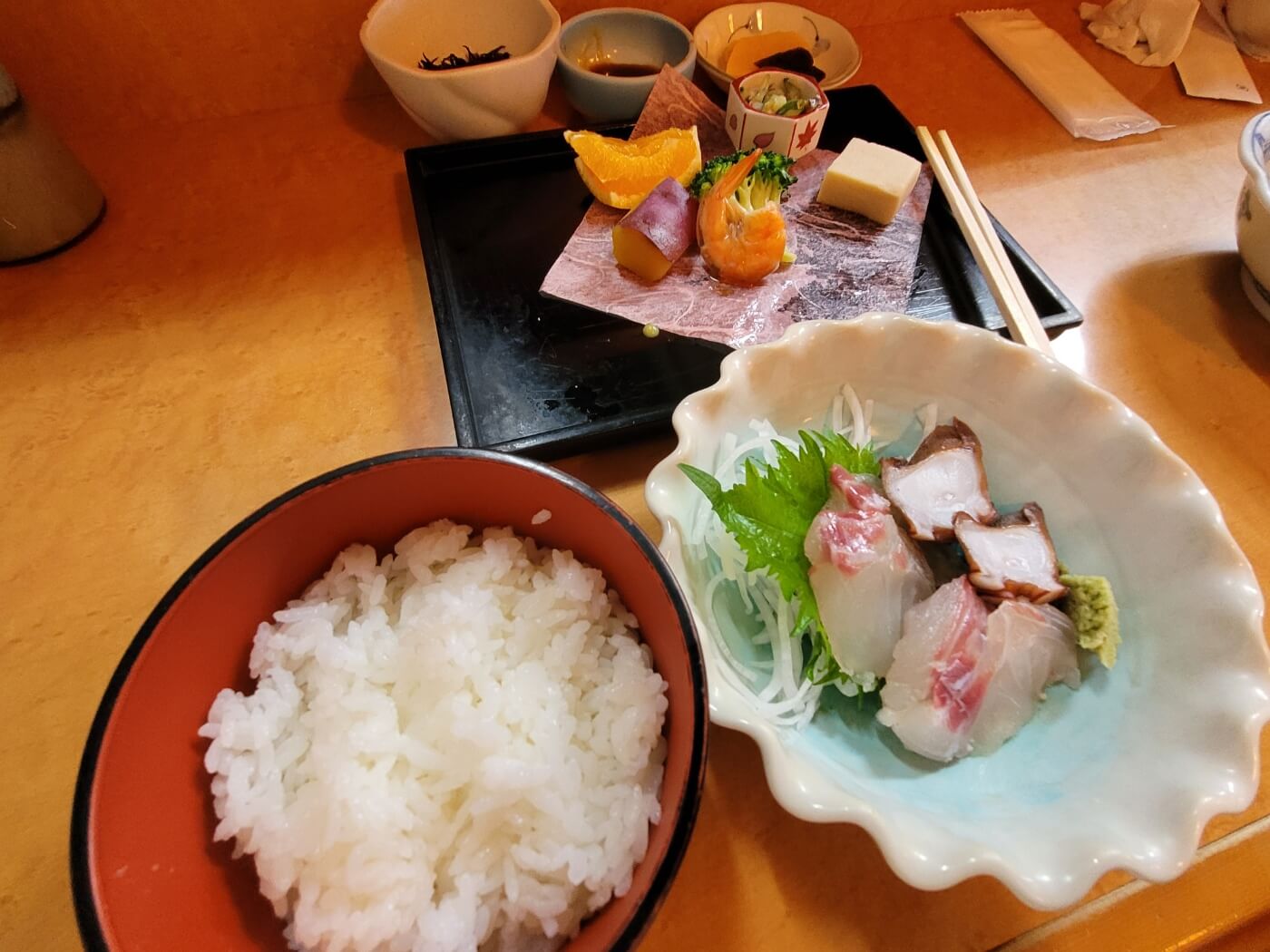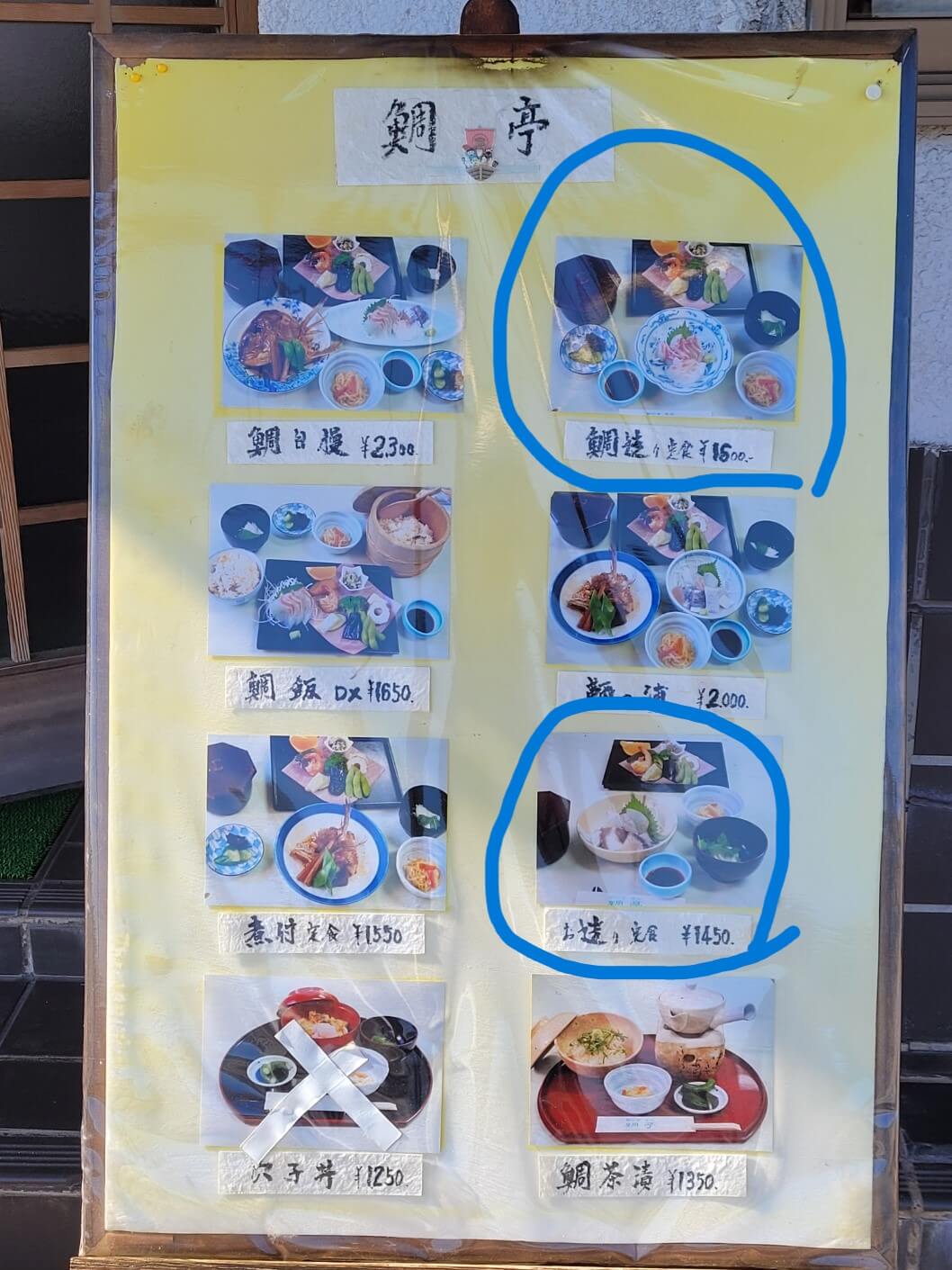 메뉴는 메뉴판의 그림을 보고 선택했는데, 도미와 문어회 정식(1,600엔)과 도미회정식(1,450엔)으로 주문했어요.