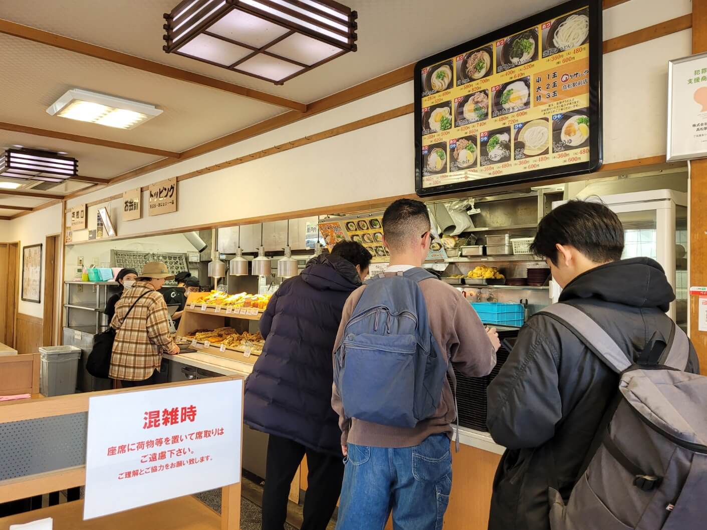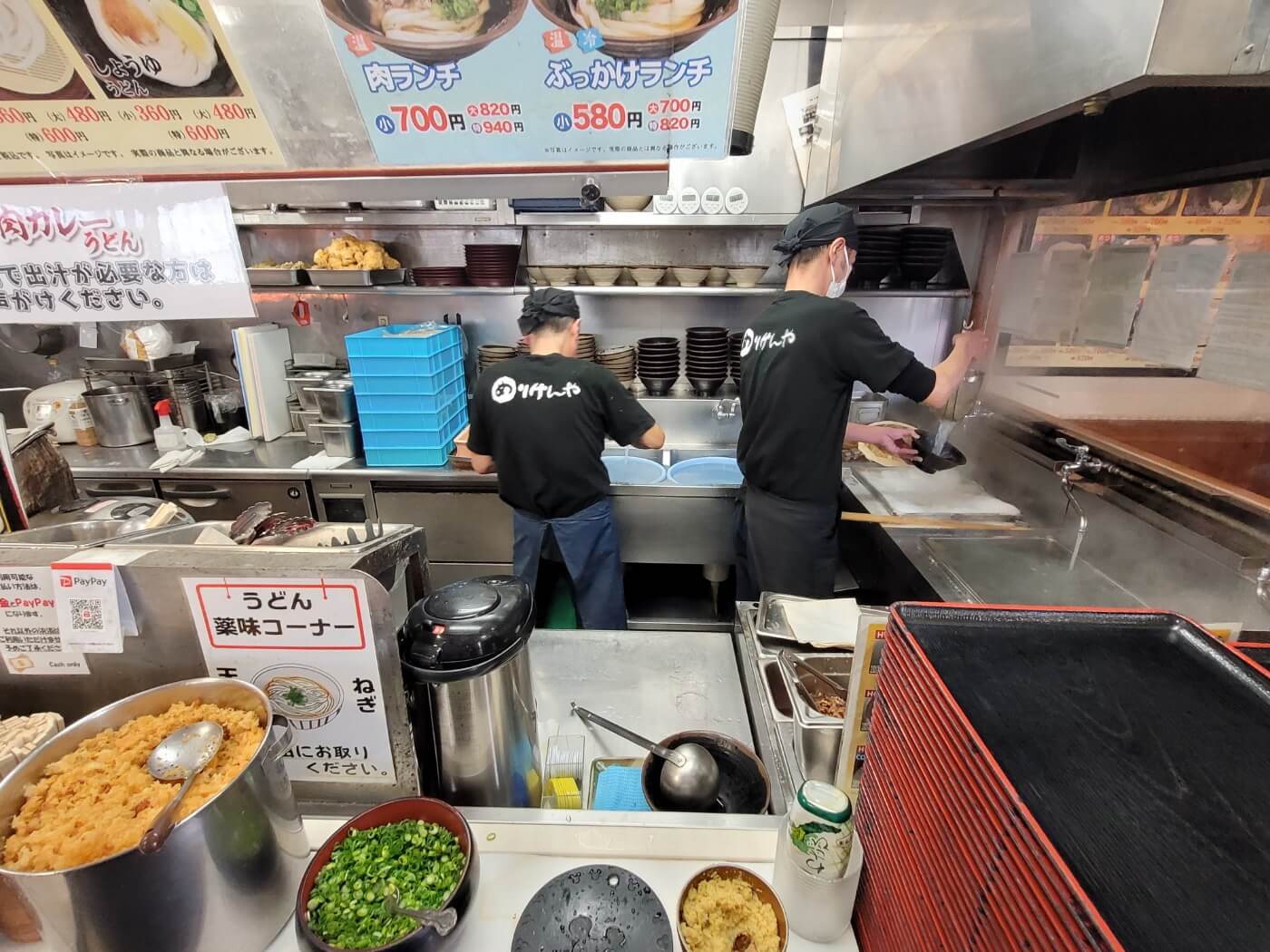 - 가게에 들어가면 순서대로 우동 종류와 사이즈를 얘기하면 바로 우동면과 육수를 담아주세요. 기호에 맞게 파 등을 올리고 튀김과 같은 토핑을 접시에 추가해서 고를 수 있어요. 계산은 줄 끝에서 하면 되고 현금만 가능합니다.