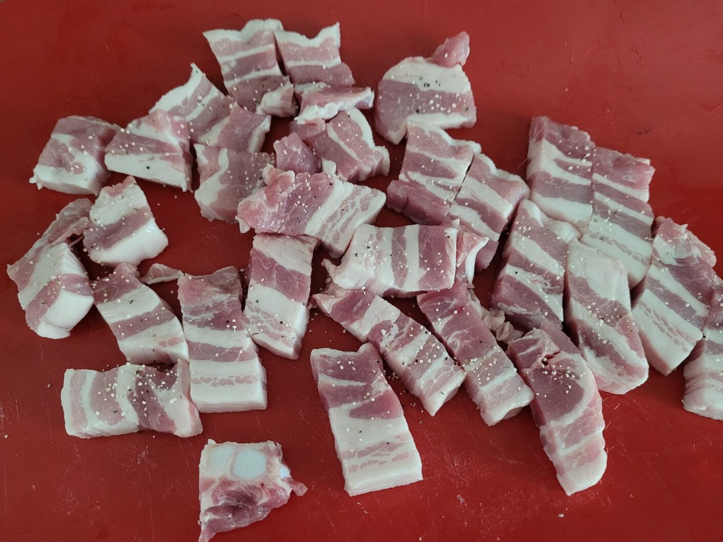 1. 삼겹살을 두툼하게 썰어주고 키친타올로 고기의 수분 제거해주세요.