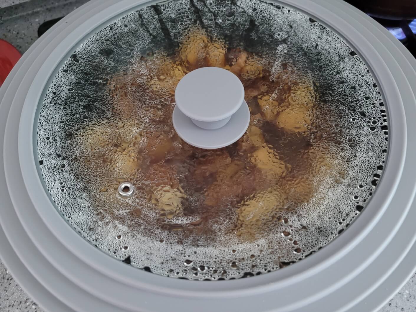 8. 여기에 콜라 100ml(배음료,사과음료 대체) 없으면 물+물엿1T을 넣고 약불로 줄인 후에 뚜껑을 덮어 10~20분 정도 천히 익주세요.