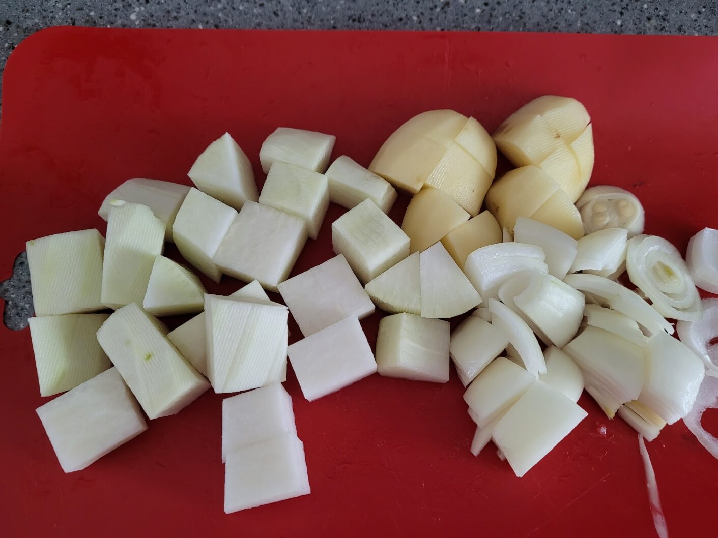 3. 무, 감자, 양파 등의 야채를 큼직하게 썰어주세요.