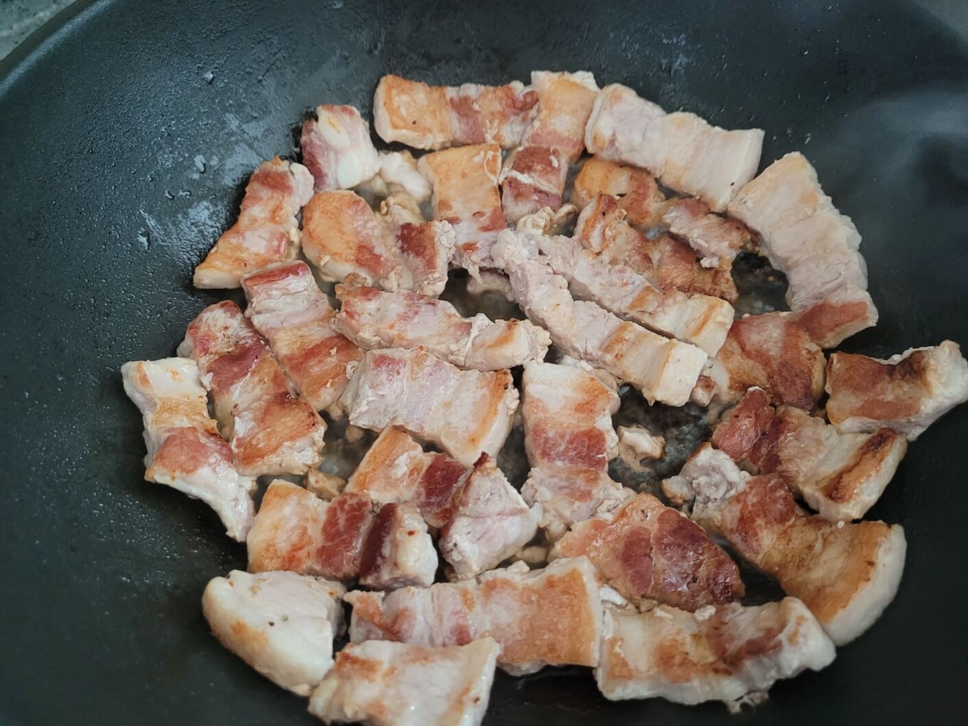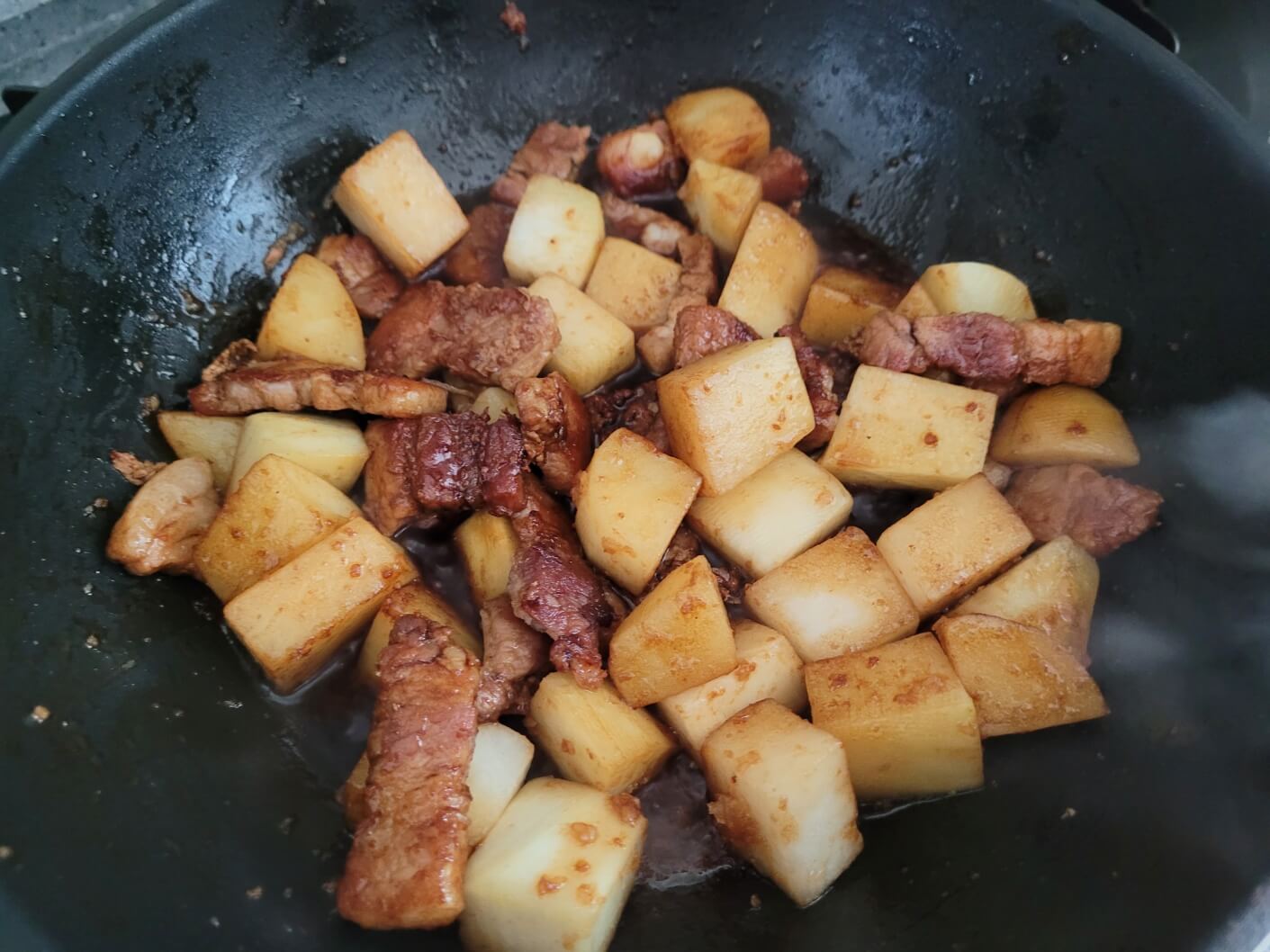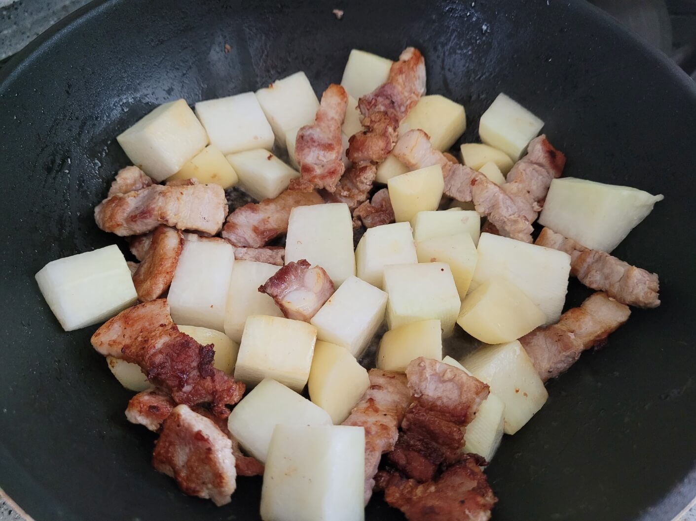 6. 잘익은 삼겹살과 함께 딱딱한 야채인 무, 감자, 당근을 넣고 충분히 볶아주세요.