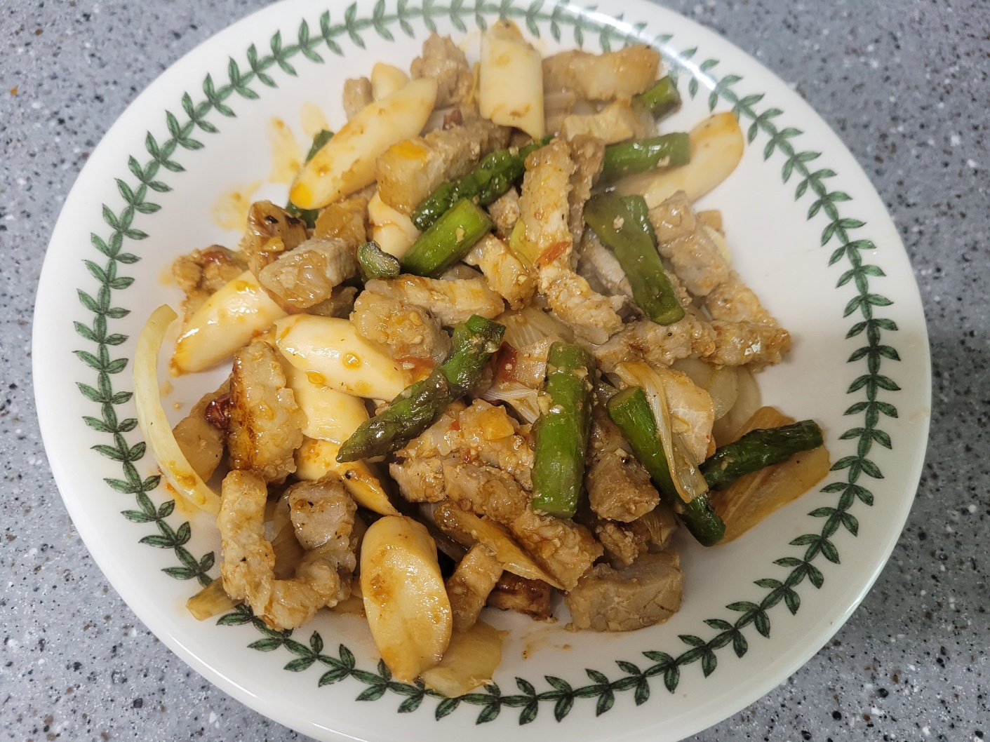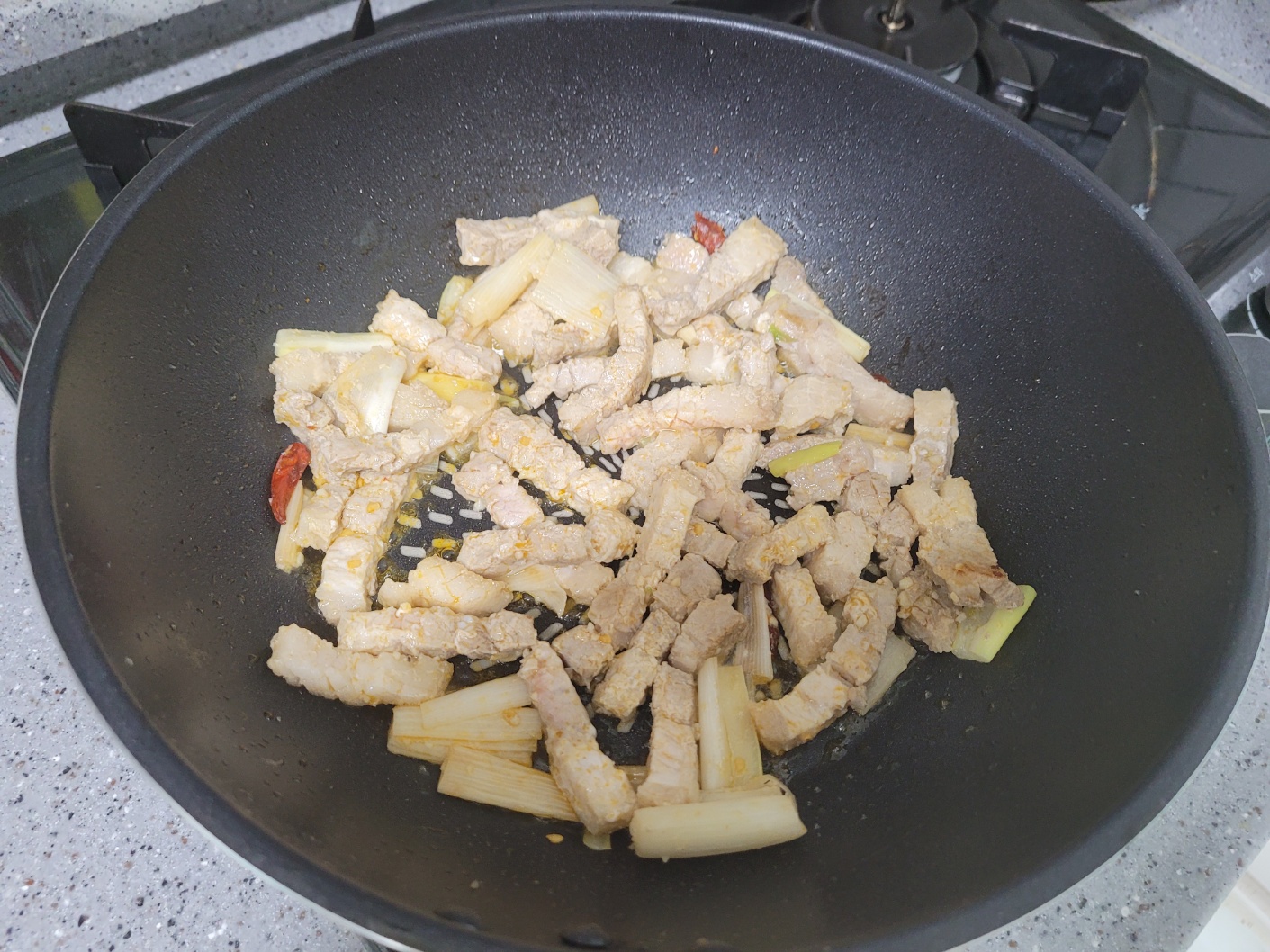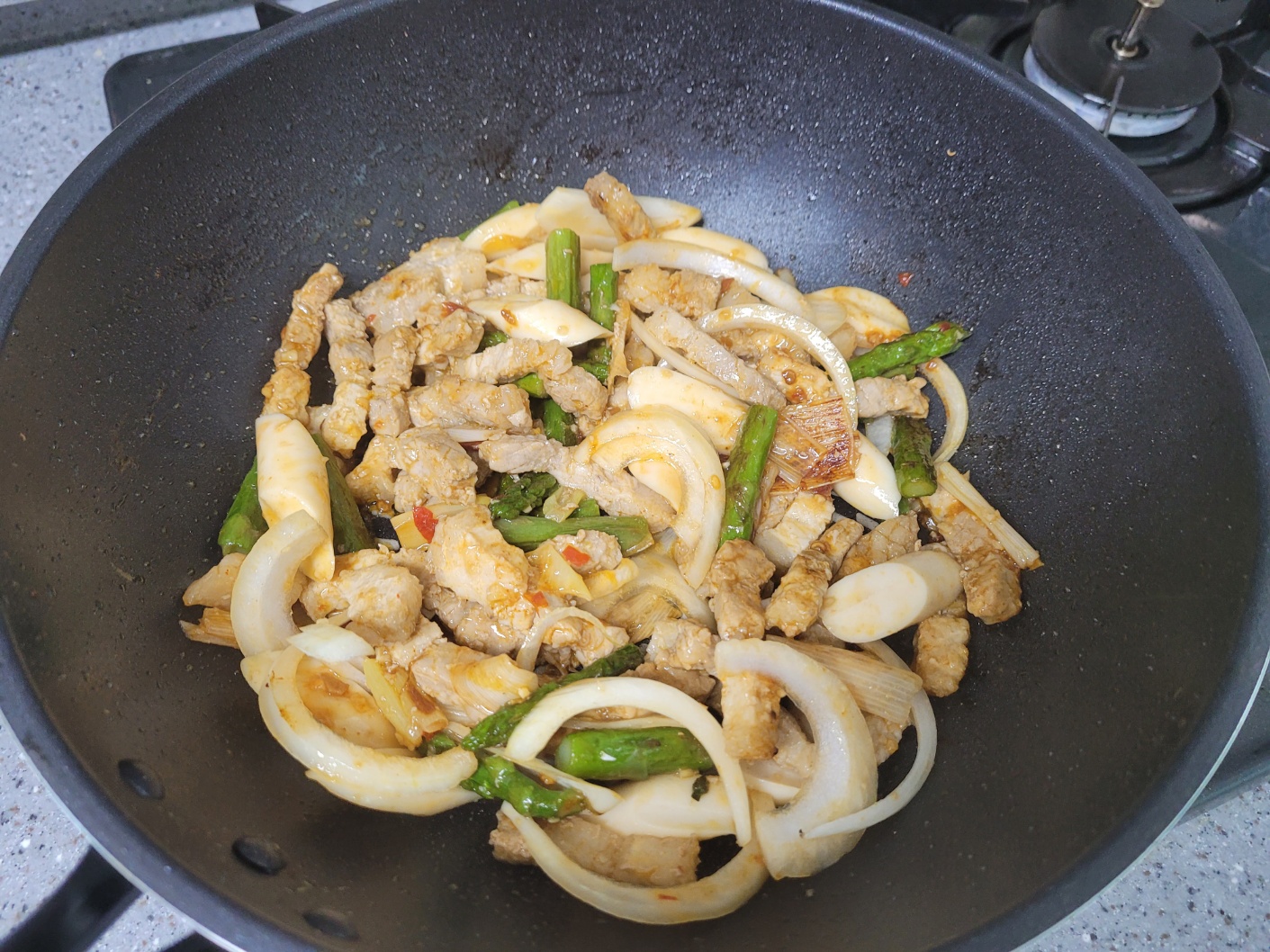 이연복 셰프의 ‘그린빈 삼겹살볶음’ 레시피에서 그린빈 대신 아스파라거스를 이용하여